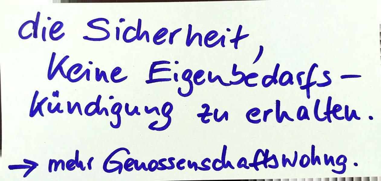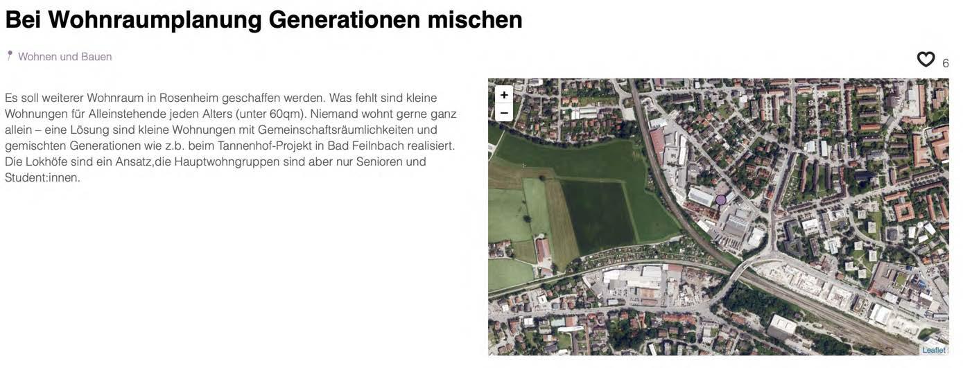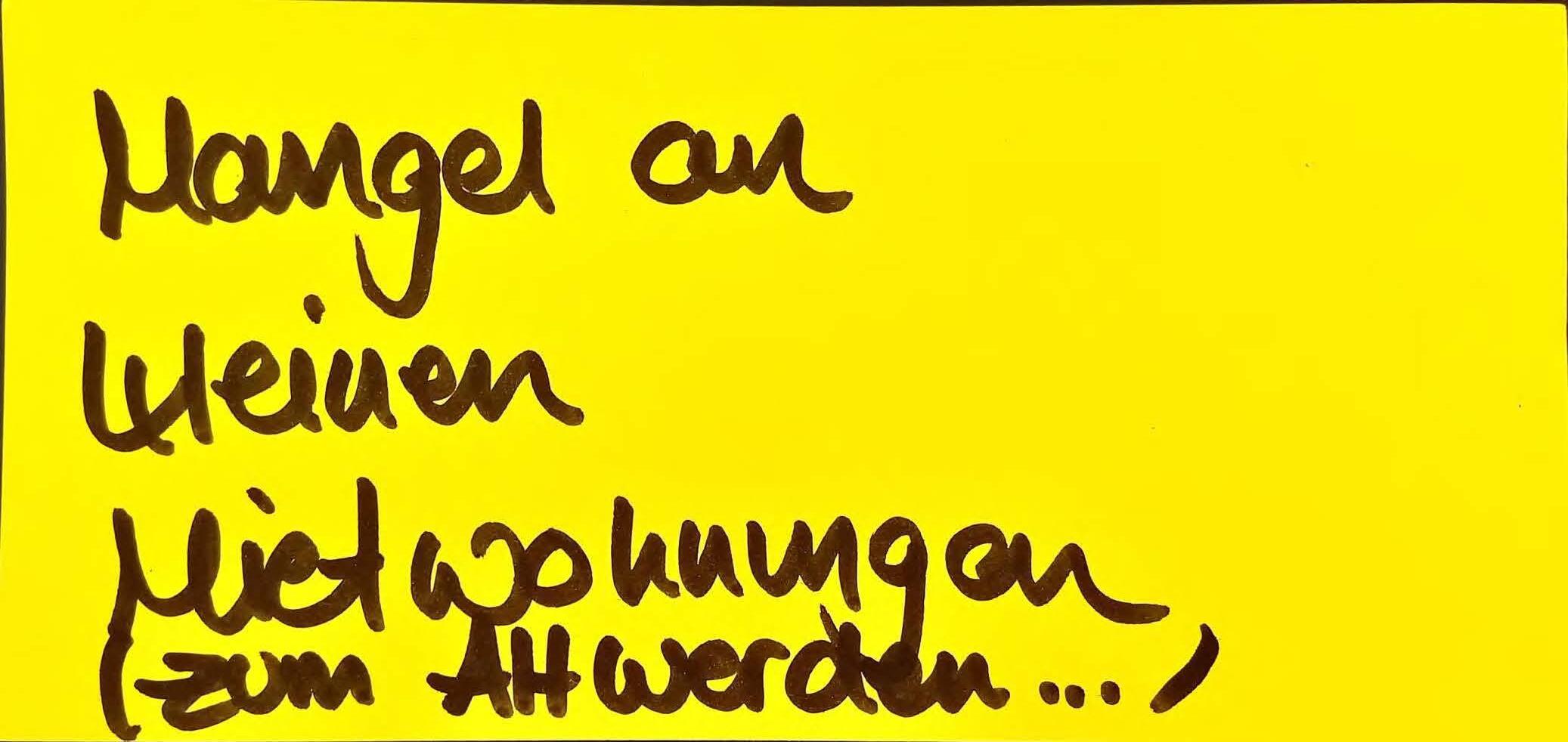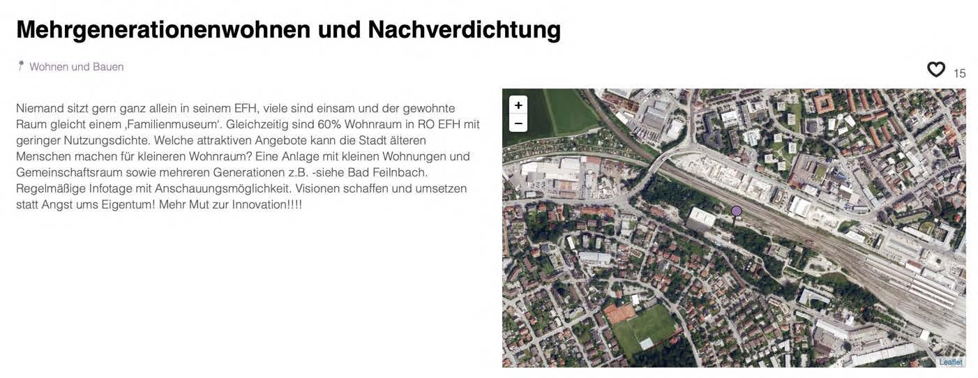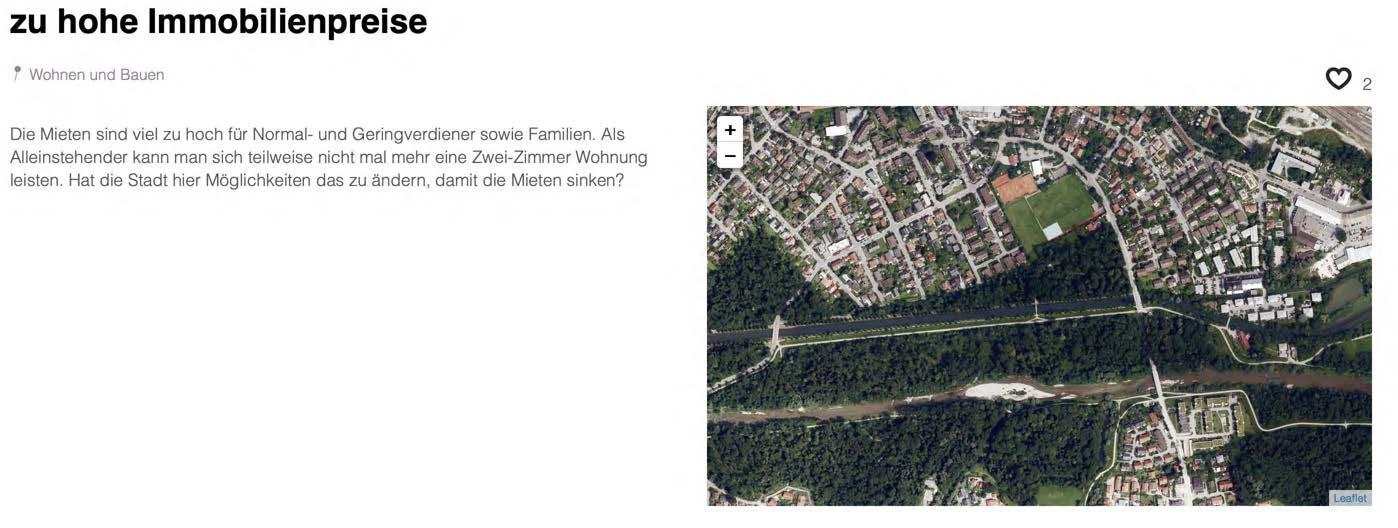 Ein mehrfach eingebrachtes Thema ist das Angebot von leistbarem Wohnraum, dazu zählt auch die allgemeine Versorgung mit Wohnraum. Dabei werden in mehreren Beiträgen bestimmte Zielgruppen, wie Familien, Mittelstand und Einheimische genannt, für die insbesondere bezahlbarer Wohnraum gefordert wird.