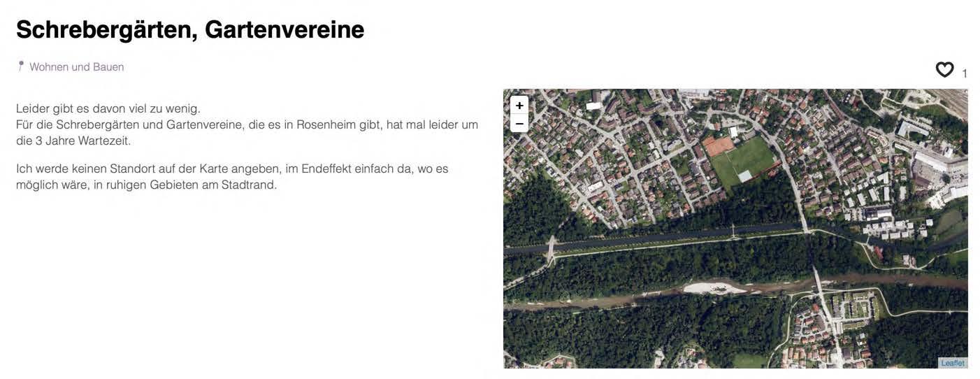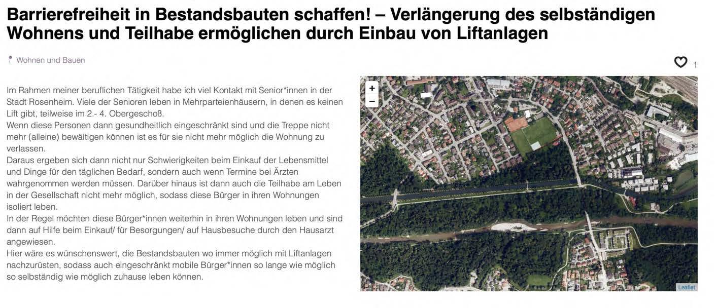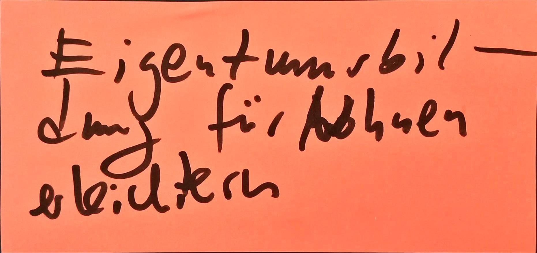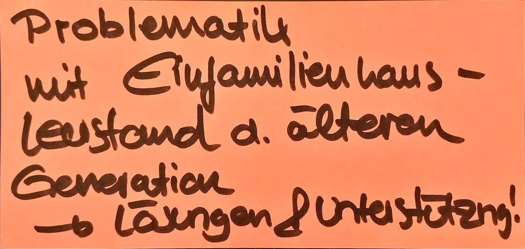 Ein mehrfach eingebrachtes Thema ist das Angebot von leistbarem Wohnraum, dazu zählt auch die allgemeine Versorgung mit Wohnraum. Dabei werden in mehreren Beiträgen bestimmte Zielgruppen, wie Familien, Mittelstand und Einheimische genannt, für die insbesondere bezahlbarer Wohnraum gefordert wird.