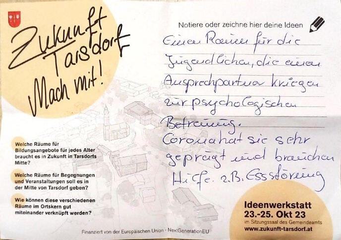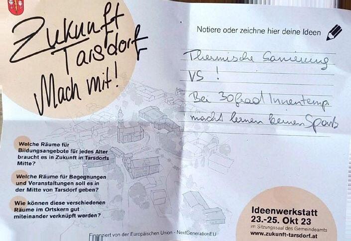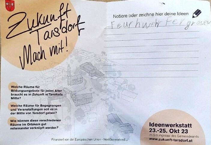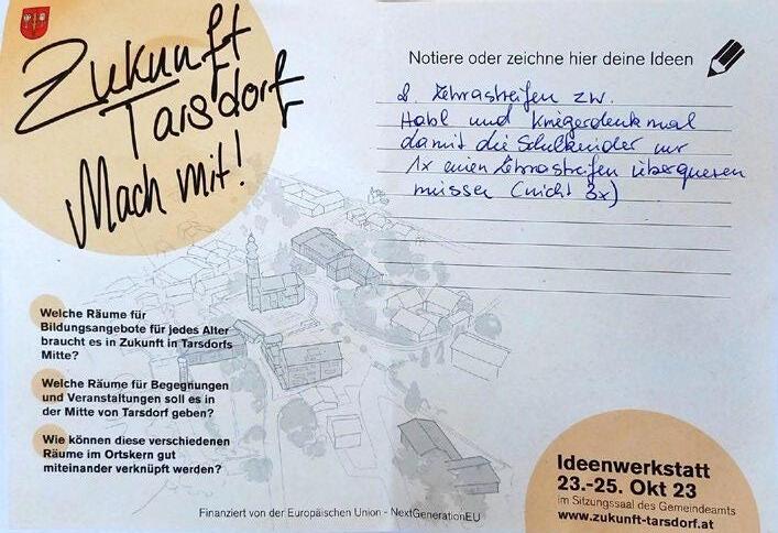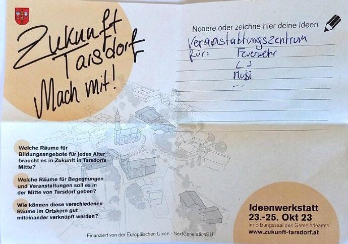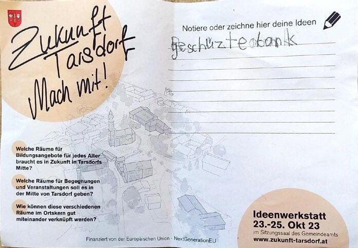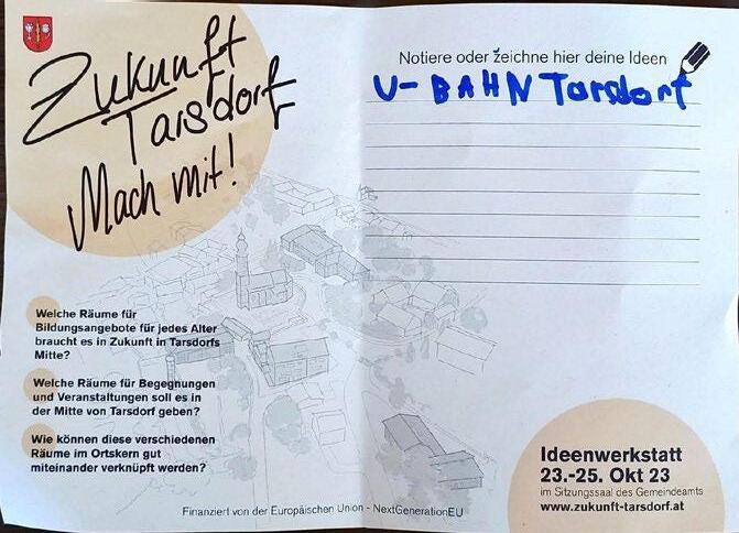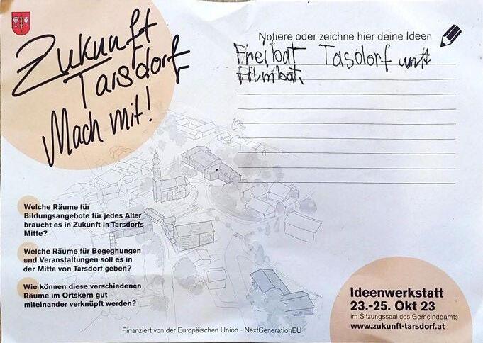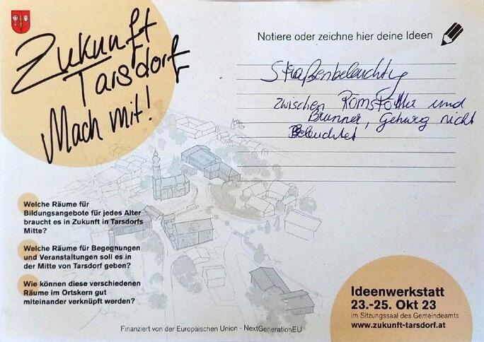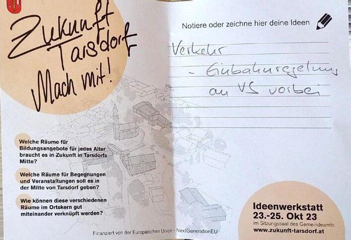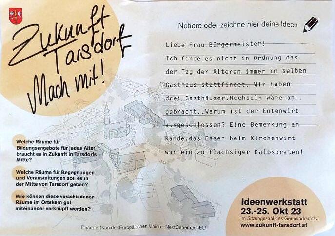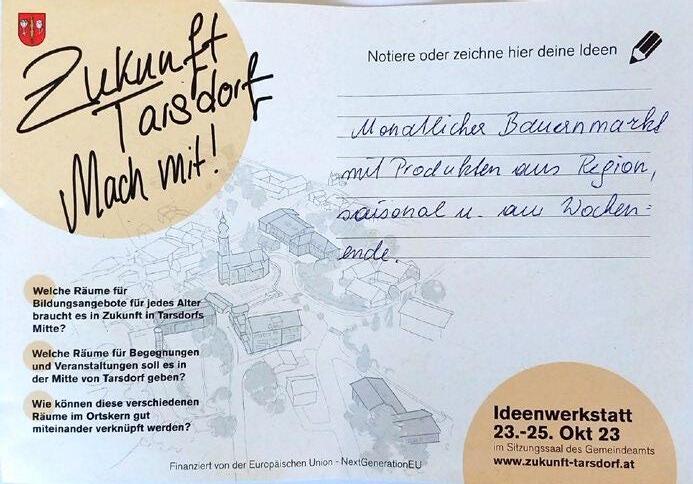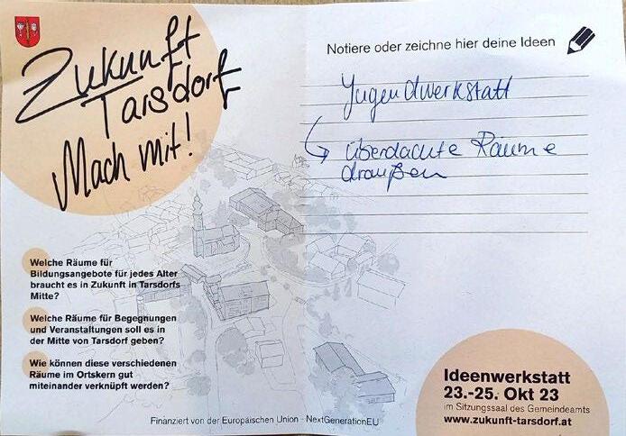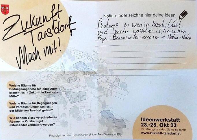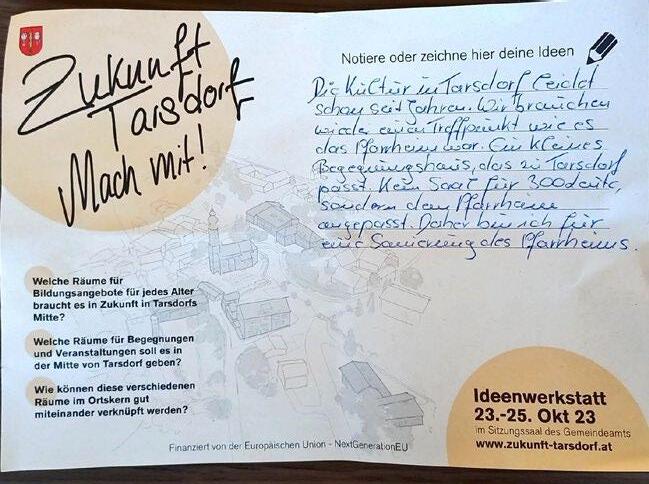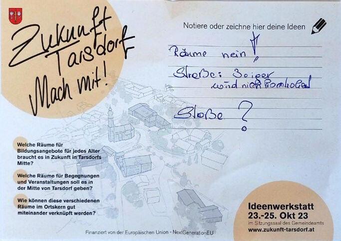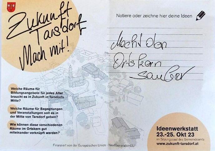 Zudem wurde vielfach der Wunsch geäußert, eine kontinuierlichere Information und Beteiligung der Bürger:innen in Tarsdorf zu etablieren. Dies reicht von der regelmäßigen Aktualisierung des Veranstaltungskalenders auf der Homepage bis hin zu Beteiligungsmöglichkeiten, wie sie im Rahmen dieses Prozesses stattgefunden haben.