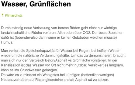 Im Kontext von Klimaschutz und Nachhaltigkeit wurden zahlreiche Ideen und Anregungen hinsichtlich erneuerbarer Energien, vermehrten Grünflächen sowie Boden- und Naturschutz eingebracht.