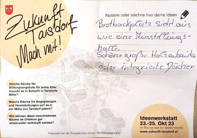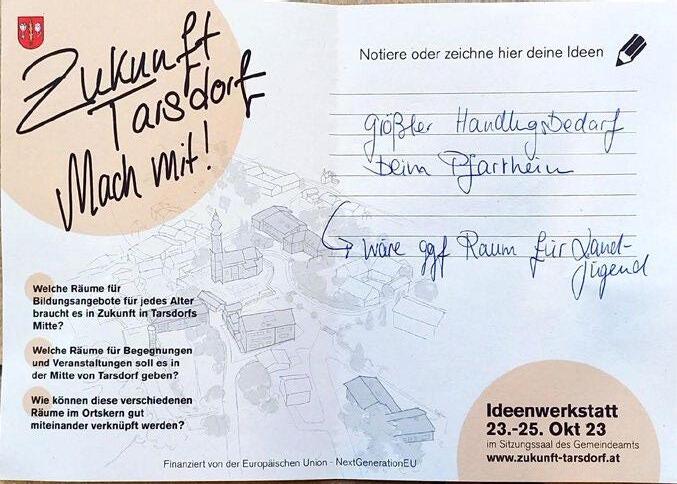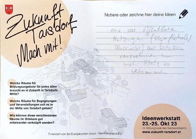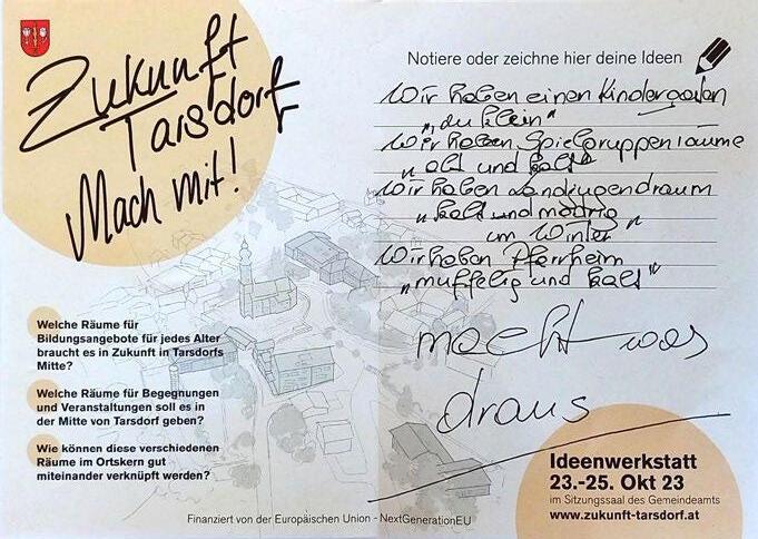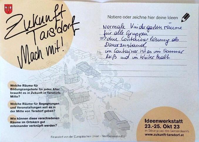 Die Sichtbarkeit der Kinder im Ortszentrum für die Tarsdorfer:innen wurde als sehr positive Qualität festgehalten, die unbedingt weitergeführt werden sollte. Der Ausbau im Zentrum bedingt jedoch auch Konsequenzen: angefangen bei einer anstehenden Verkehrsberuhigung, über die Ausgestaltung des öffentlichen Raums, ein Abwägen einer Entflechtung des bestehenden Nutzungskonfliktes zwischen Kindergarten und Feuerwehr im Zentrum und die Ausstattung mit ausreichend Personalressourcen für die Herausforderungen Entwicklung auf unterschiedlichen Standorten beziehungsweise das Anerkennen von Kapazitätsgrenzen.