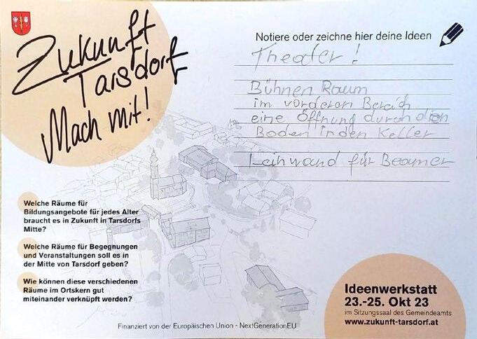Am Tisch, der sich mit der zukünftigen Ausgestaltung eines Veranstaltungsraums für Tarsdorf befasste, wurde zunächst klargestellt, was dieser Raum nicht sein soll: Er soll keine private Partylocation werden. Die Größe muss nicht mit dem Kultus in Ostermiething vergleichbar sein, sondern den lokalen Bedürfnissen entsprechen. Stattdessen sollen unterschiedliche Vereinsaktivitäten dort Platz finden, wie beispielsweise die Landjugend KFB. Der Raum soll geeignet sein, sowohl Theateraufführungen als auch gemütliche Spielenachmittage oder schulische Veranstaltungen wie etwa die jährliche Faschingsfeier zu beherbergen.