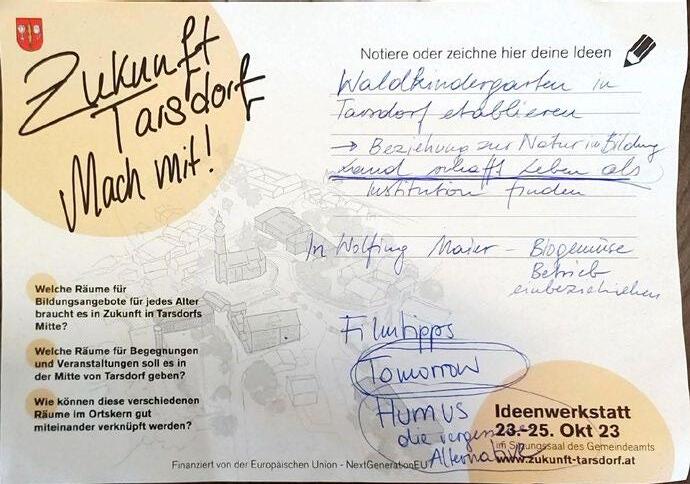 Gemeinsam mit einer Schulklasse der Volksschule wurde eine Reise in die Zukunft von Tarsdorf unternommen. Nach Abschluss der Traumreise berichteten die Schüler:innen von ihren Eindrücken, den Szenarien, die sie in der Zukunft gesehen, gefühlt, gerochen und erlebt haben. Alle geschilderten Erlebnisse und Visionen der Schüler:innen wurden von nonconform auf einem Flipchart dokumentiert, das oben sichtbar ist.