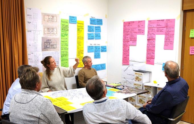 Im Themenfeld Wohnen äußerten die Bürger:innen den Wunsch nach betreuten und barrierefreien Wohnangeboten. Dabei streben sie an, auch im Alter mitten im Dorfgeschehen wohnen und leben zu können. Diese Wohnformen sollen in Verbindung mit anderen Funktionen entwickelt werden, um den Ortskern zu beleben.