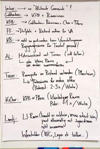 Ebenso wurden Besprechungs- und kleinere Sitzungsräume als fehlende Bedarfe beschrieben, die über eine Teeküche, barrierefreie Zugänge und diverse Lagermöglichkeiten verfügen. Der Kirchenchor wünscht sich eine Probemöglichkeit in Räumlichkeiten ohne Hochwasserschaden. Als neue Bedarfe werden ein Café (oder niederschwelliger Treffpunkt) sowie eine öffentliche Bücherei mit Topothek genannt. Im Dachgeschoß des Gemeindeamtes, dem Gemeindesitzungssaal und dem Dorfplatz wird weiteres Ausbaupotenzial durch eine intensivierung der Nutzungen, eine Überdachung, ein Maibaumloch oder einfache Sitzmöglichkeiten verortet.