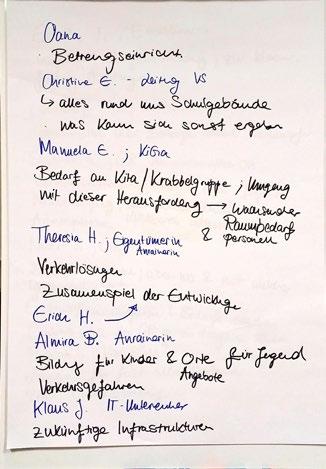 klusion soll als Zukunftsthema weitergeführt werden, der Dorfplatz kann als Dreh- und Angelpunkt für die Übergänge zwischen den Einrichtungen in Zukunft kindergerecht ausgestaltet werden und der gesamte Ortskern muss einer kindgerechten Verkehrsberuhigung unterzogen werden, wenn die Standorte für die Kinderbildung nicht an einem gemeinsamen Grundstück erfüllt werden können.