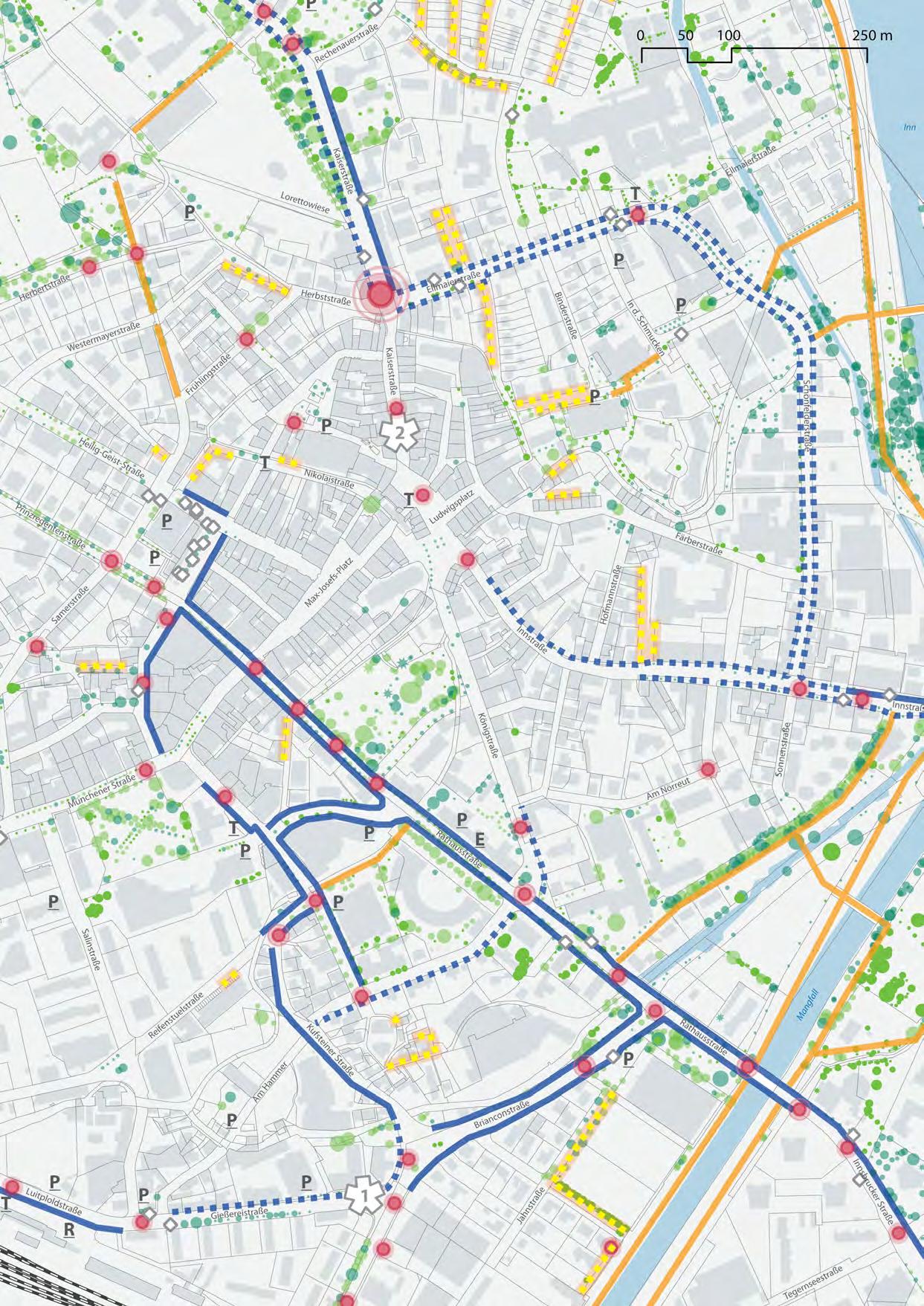 Die vielseitigen, öffentlich nutzbaren Grünund Freiraumbereiche Rosenheims gelten als besonderes Merkmal für das Wohlbefinden in der Stadt, insbesondere nach den Interventionen der Landesgartenschau 2010. Diese Grünbereiche im Besonderen, wie auch alle anderen grünen Freiräume sind langfristig zu erhalten, weiter zu vernetzen und in einer umweltgerechten und ökologisch nachhaltigen Herangehensweise zu gestalten. Attraktive öffentliche Räume und Angebote schaffen eine positive Wahrnehmung der Stadt. So hat Rosenheim die Möglichkeit, sich als dynamische und lebendige Stadt zu präsentieren. Hierfür soll das Zentrum auf die zukünftigen klimatischen Veränderungen vorbereitet werden. Es gilt zudem Hitzeinseln zu reduzieren, Verschattung durch Bäume zu fokussieren und Entsiegelungspotentiale zu nutzen.