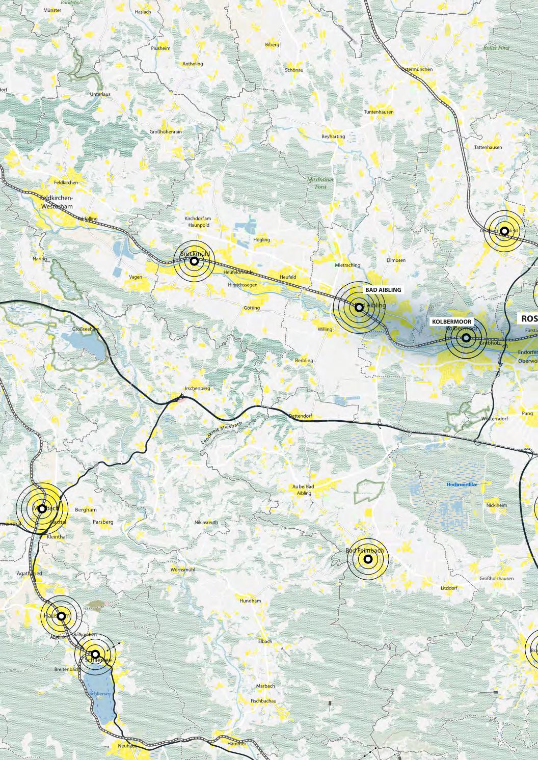 Weitere funktionale Verflechtungen bestehen zudem neben München vor allem nach Osten in den Großraum Salzburg über Traunstein, sowie über das Inntal nach Kufstein. In den südlichen Nachbargemeinden von Rosenheim beginnt zu-