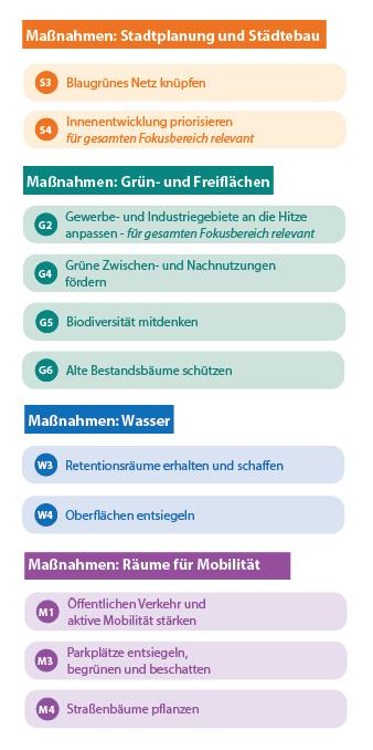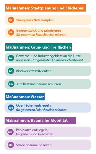Um die klimatischen Bedingungen in diesem Bereich zu optimieren, sind verschiedene Maßnahmen vorgesehen, insbesondere die Maßnahmen S3, G2, W4, M3 und M4. Diese umfassen unter anderem die Teilentsiegelung von Parkplatzflächen, die Pflanzung von Gehölzen auf diesen Flächen sowie die Begrünung von Dächern und Fassaden. Ziel ist es, die versiegelten Flächen ökologisch aufzuwerten und einen positiven Einfluss auf das Mikroklima des Gewerbegebiets zu erzielen.
