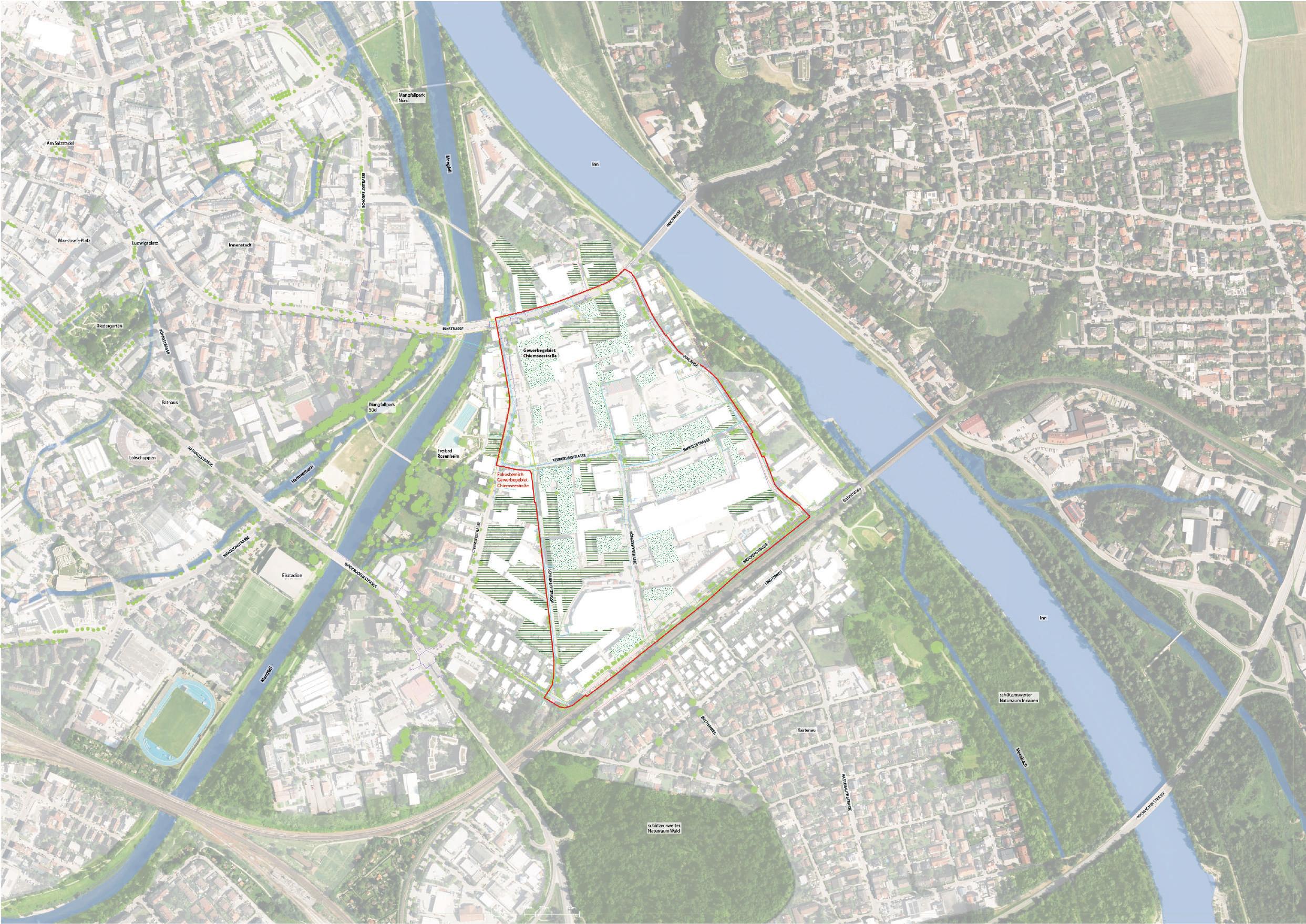Die genannten Maßnahmen verfolgen das übergeordnete Ziel, das Gewerbegebiet Chiemseestraße nachhaltiger und ökologischer zu gestalten. Durch die Kombination aus Begrünungsmaßnahmen, verbesserter Mobilitätsinfrastruktur, naturnahem Regenwassermanagement und einer stärkeren Vernetzung mit den umliegenden Naturund Erholungsräumen soll die Standortqualität langfristig gesteigert und ein Beitrag zur klimaangepassten Stadtentwicklung geleistet werden.