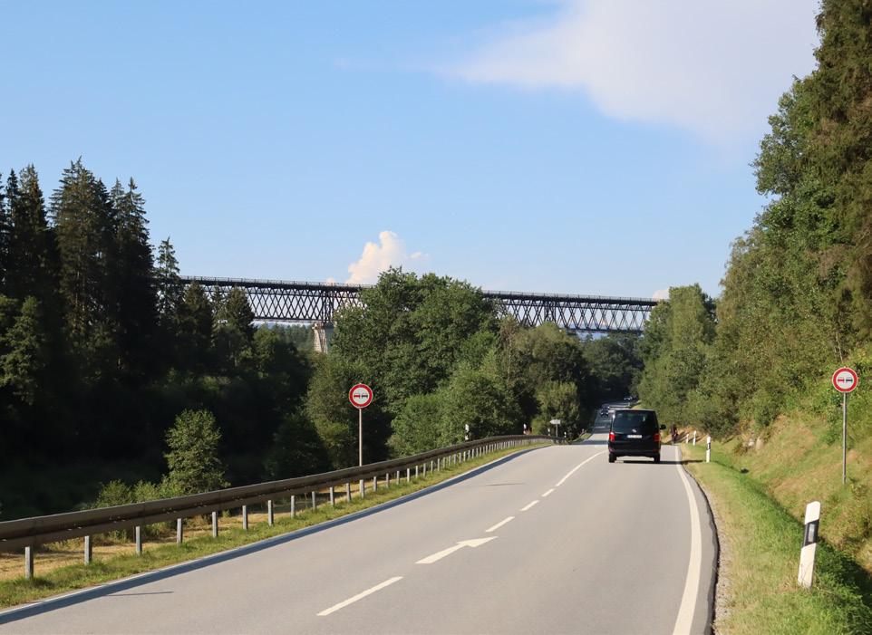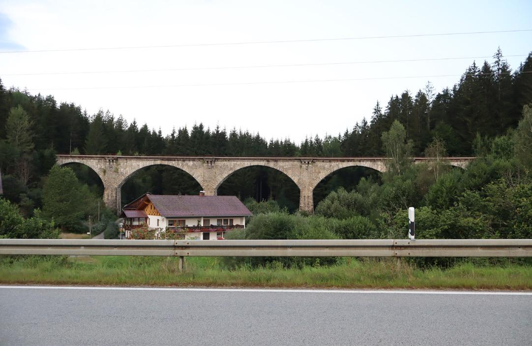 Verkehrsbauwerke prägen bis heute den Landkreis auf ziemlich eindringliche Art und Weise. Allen voran ist die Eisenbahn zu nennen. Heute aber fallen auch die zum Teil stark ausgebauten Bundes-, Staats- und Landstraßen auf. Doch zunächst zur Eisenbahn: Die Strecke von Plattling nach Bayerisch Eisenstein ging schon 1877 in Betrieb. Im Jahr 1890 wurde sowohl das Teilstück von Gotteszell nach Blaibach, als auch von Zwiesel nach Grafenau eröffnet. Erst 1928 schließlich wurde das Streckenstück von Zwiesel nach Bodenmais in Betrieb genommen. Der Bau der Strecken war extrem aufwändig und umfasste einige Tunnel, mehrere große Viadukte und Brücken, tiefe Geländeeinschnitte und beträchtliche Dammbauten. Diese Bauwerke sind zum Teil spektakulär und stehen heute in ihrem technisch-konstruktiven Aufwand in merkwürdigem Missverhältnis zu den kurzen Schienenbussen, die sie nutzen. Dessen ungeachtet lässt bereits ihre regionale Bezeichnung als ‚Waldbahn‘ erkennen, welchen starken identifikatorischen Wert die vier Strecken im Landkreis besitzen. Die ingenieurtechnischen Leistungen, welche der Bau abverlangte, sind heute noch unverstellt erfahrbar. Einprägsame Beispiele sind die Brücke über die Staatsstraße 3521 kurz vor Regen (Ohetalbrücke, siehe Abb. 4.7.1), aber auch die Brücken über den Schwarzen Regen zwischen Regen und Zwiesel. An anderer Stelle bilden gemauerte Bogenviadukte, wie zum Beispiel in Reisachmühle bei Zwiesel, einen fast bühnenhaften Hintergrund für die Präsentation der Kulturlandschaft Bayerischer Wald (Abb. 4.7.1). An anderer Stelle bildet die Strecke einen drastischen, merkwürdigen Gegensatz zu den abgelegenen Waldlandschaften, die sie durchquert (Abb. 4.7.1). Nicht zuletzt diese Besonderheit verhalf der Strecke nach Viechtach zur Bezeichnung ‚Bayerisch Kanada‘. Störend wird die Bahn indes an keiner Stelle, sondern eher wie die Vervollständigung einer Idealvorstellung einer klassischen deutschen Mittelgebirgslandschaft. Hinzu kommen die baulichen Anlagen entlang der Streckenführungen: Empfangsgebäude, Güterschuppen, Wohnhäuser für Bedienstete und so weiter. Diese Gebäude folgen einem einheitlichen Entwurf und sind sämtlich von hohem ästhetischen Wert. Architektonisch orientieren sie sich an regionalen Bautraditionen. Selbst wenn sie im Zuge von Rationalisierungen aus der eisenbahnbezogenen Nutzung genommen wurden, so werden sie heute erfolgreich für andere Zwecke genutzt.