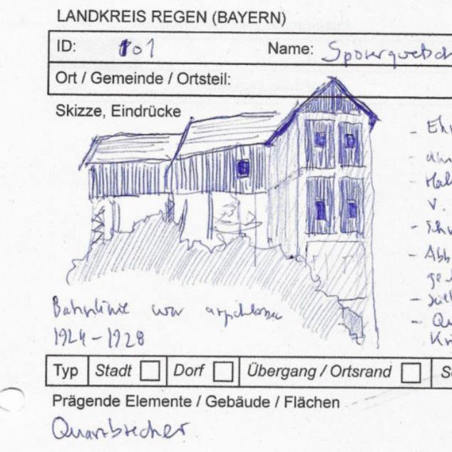 Der Ort Frankenried (Nr. 038) und die unmittelbar südöstlich liegenden Bereiche entlang des ‚Pfahls‘ waren ursprünglich stark vom Tagebau und den Steinbrüchen geprägt (Nr. 040, siehe Abb. 4.6.3). In Frankenried befindet sich am südlichen Ortsausgang ein Vorarbeiterhaus für einen Steinbruchbetrieb; es ist vollständig aus Zyklopenmauerwerk aus Granit errichtet. In dem unterhalb liegenden Waldstück bis nach Patersdorf sind zahlreiche Waldseen anzutreffen, die auf Steinbrüche zurückgehen. Auch Lorenbahnen hatte es offenbar gegeben, von denen jedoch zunächst nichts mehr erkennbar ist.