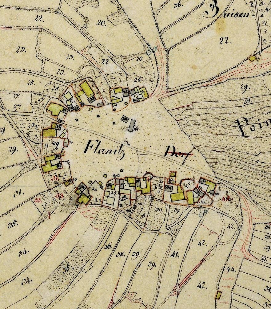Abb. 4.4.2: Flanitz 1829 besaß zwei Brechhäuser, die weit außerhalb der Siedlung lagen (Pfeil). In beiden Fällen handelte es sich um schmale, längsrechteckige Gebäude. Flanitz, Gemeinde Frauenau, Landkreis Regen Uraufnahme