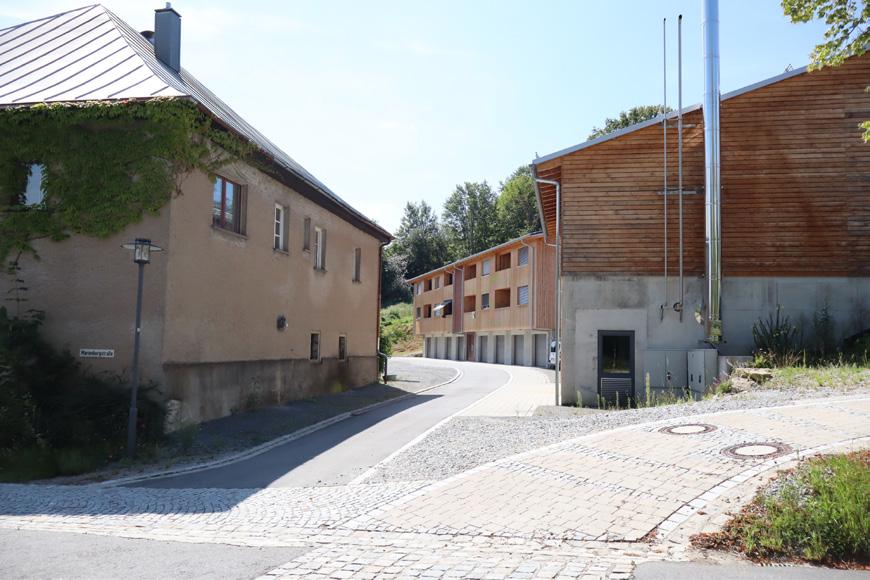 Abb. 4.3.3: Kirchdorf im Wald (080). Neben dem ehemaligen Gasthof Post liegt eine soeben fertiggestellte Mehrfamilienhausanlage mit eigenem Blockheizkraftwerk, das mit Hackschnitzeln betrieben wird.