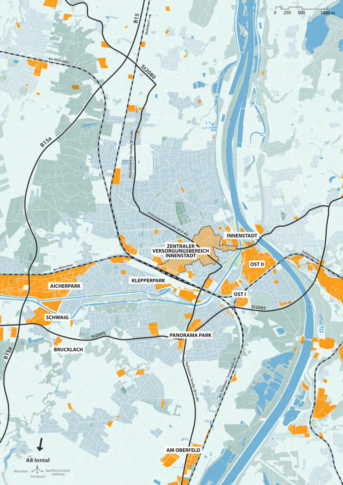Aufgrund des Wohnungsbedarfs und des ungebrochenen Interesses an GewerbeLächen sind Optionen zu Nachverdichtung und Innenentwicklung ein wichtiger Schlüssel, um die begrenzte StadtLäche Rosenheims besser zu nutzen. Das Flächenmanagement ist dafür ein Handlungsfeld, das kontinuierlich betrieben werden soll. Dazu ist eine quartiersgenaue planeri-