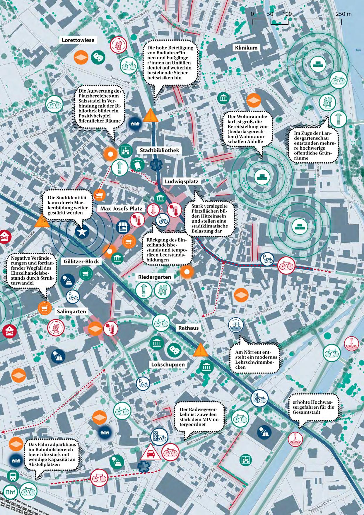 DieSWOT-Analysewirdinnebenstehender KartierungimgesamtstädtischenMaßstab dargestellt.Darinsindsowohlverortbare StärkenderstädtischenStruktur,feststell‐bareSchwächenundanzunehmendeRisi‐ken,aberauchkonkreteChancenabgebil‐det.