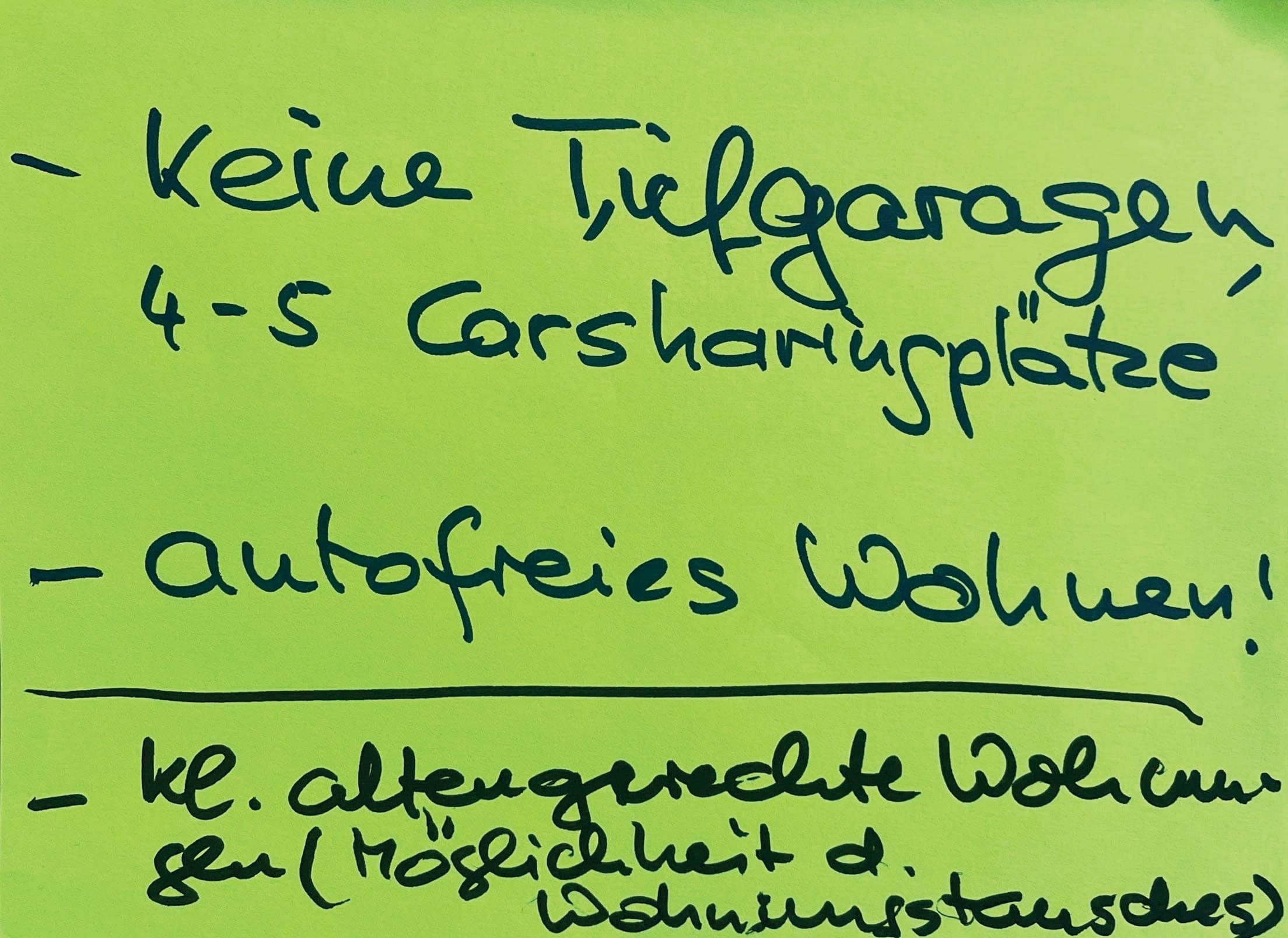 Es gibt keinen Konsens dazu, ob hier ein autofreies Wohnquartier entstehen soll oder nicht. Jedenfalls soll aber die Bedeutung des PKWs generell reduziert werden. An der Oberfläche im Hof soll es möglichst keine PKWs geben. Carsharing soll unterstützt und die Fahrradnutzung durch entsprechende Stellplätze – auch für Lastenfahrräder – gefördert werden. Sollte eine Tiefgarage errichtet werden, soll die Störung durch notwendige Zufahrten minimiert werden. Fluchtwege aus dem Hof und die Zugänglichkeit für Einsatzkräfte sind selbstverständliche Eckpunkte der Planung. Eine „Durchfahrt“ für PKWs soll keinesfalls entstehen.