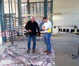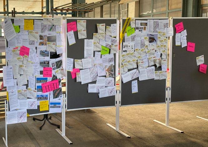 Tagsüber Ideenbüro in der alten Fertigungshalle auf der Salzmanninsel: Gesprächen am Modell, an der Ideenwand und am Luftbildteppich