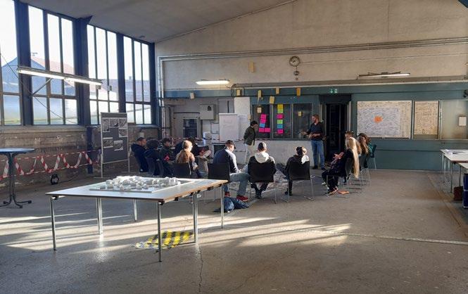Von vielen Besucher:innen des temporären Ideenbüros in der alten Fertigungshalle wurde viel Potential des Ortes gesehen, das schon jetzt genutzt werden soll. In Workshops und in Gesprächen wurden immer wieder Ideen für Zwischennutzungen der alten Gebäude für Gemeinschaftsprojekte und Pop-UpAngebote wie Werkstätten, Ateliers, Ausstellungen, Café, Proberäume und andere kulturelle Nutzungen eingebracht. Auch für noch fehlende Räume des neuen Hochschulstandortes in Traunstein könnten hier temporär Räume genutzt werden. Das frühere Einfamilienhaus der Familie Salzmann wird seit kurzem temporär als Wohnung für Studierende des neuen Hochschulstandortes genutzt. Insgesamt sollen Zwischennutzungen der leeren Räume auf der Insel die Entwicklungen in Gang halten und zukünftige Nutzungen frühzeitig testen. Soziale und kulturelle Treffpunkte brauchen nicht nur Flächen, sondern auch Zeit und Freiraum, um zu entstehen. Öffentlichkeit und Verbundenheit mit einem Ort können nicht geplant werden, sondern entwickeln sich. Deshalb sollten schon jetzt Räume für solche gemeinschaftlichen Nutzungen angeboten und Veranstaltungen initiieren werden. So kann das neue Wohnprojekt auf der Salzmanninsel von Anfang an ein lebendiger Ort und Treffpunkt im Viertel werden.