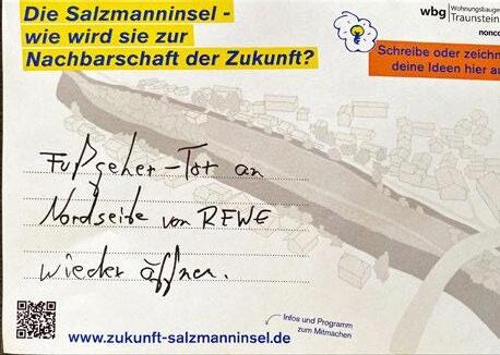 Die Ideen und Bedarfe zur Mobilität spiegeln den Bedarf der Bürger:innen wider, die Fortbewegung in Traunstein nachhaltiger, sicherer und zugänglicher zu gestalten. Einer der wichtigsten Bedarfe ist der Ausbau von Rad- und Fußwegen, sowohl entlang des Traunufers als auch innerhalb des Quartiers.