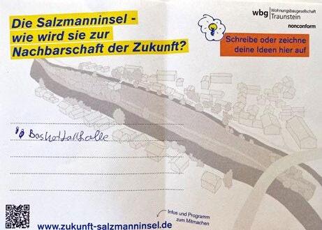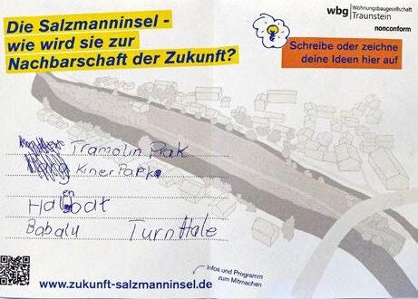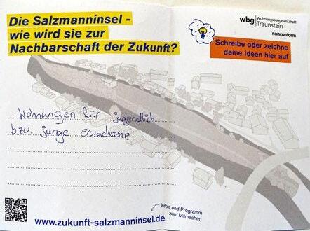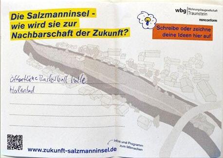 Die Salzmanninsel soll mehr als nur ein Wohnquartier werden - sie soll zu einem lebendigen und identitätsstiftenden Ort für die gesamte Gemeinschaft werden. Die Bürger:innen haben dazu eine beeindruckende Bandbreite an Ideen eingebracht, die zeigen, wie die Insel zu einem vielseitigen und inklusiven Ort