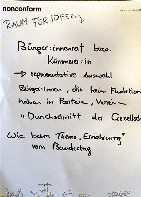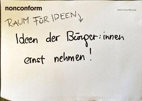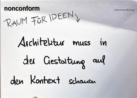 Zusätzlich zu den hier dokumentierten, schriftlichen Beiträgen flossen auch die Eindrücke aller Teammitglieder von nonconform aus den persönlichen Gesprächen mit den am Prozess Beteiligten in das Ergebnis ein.