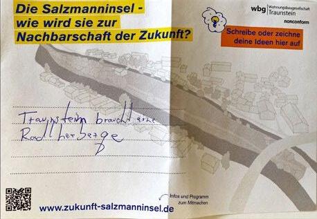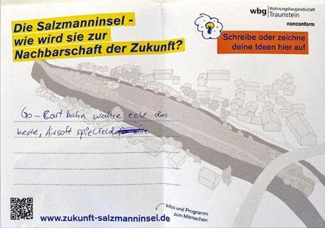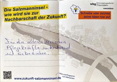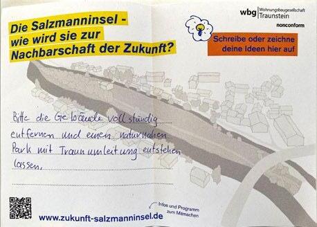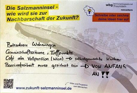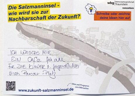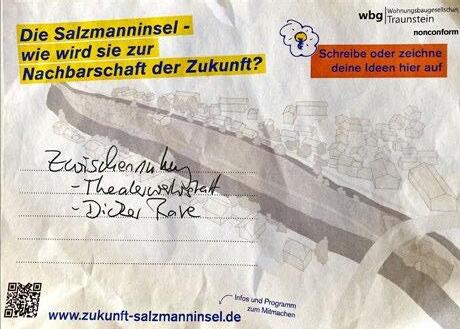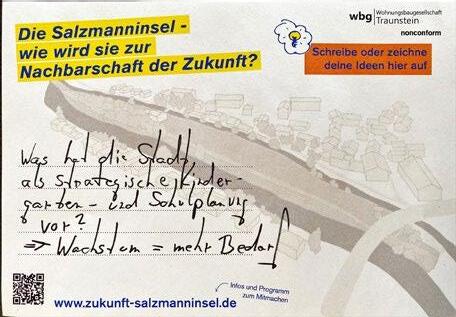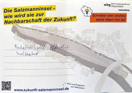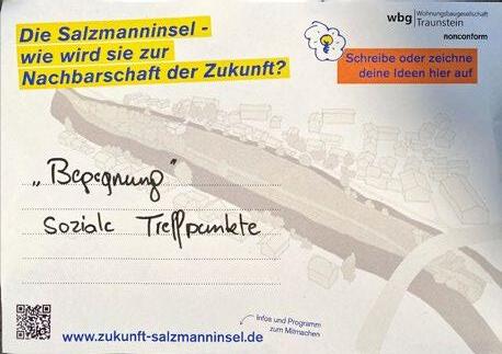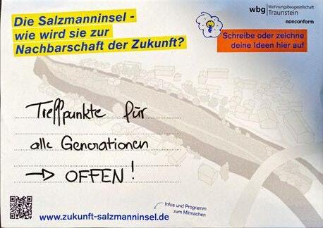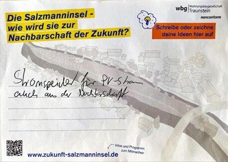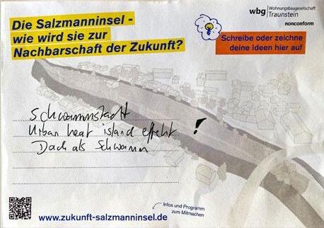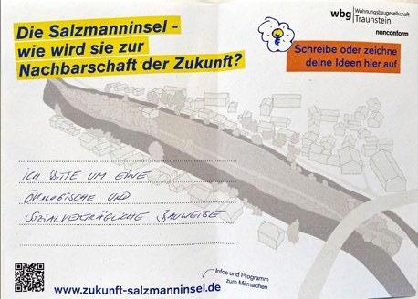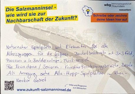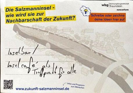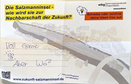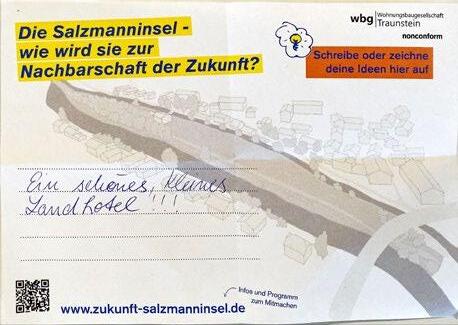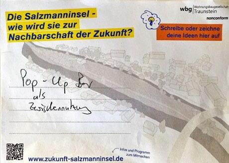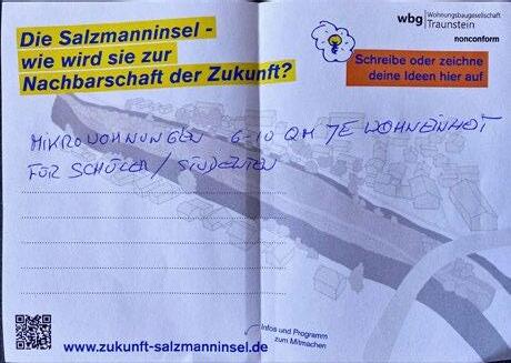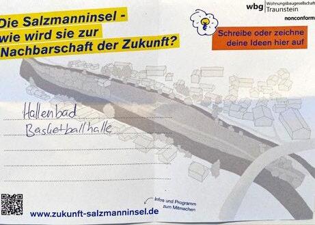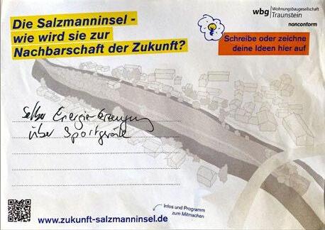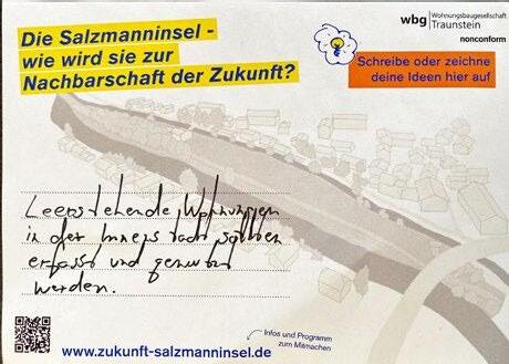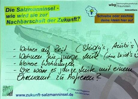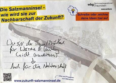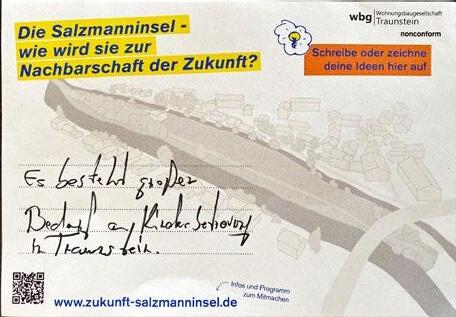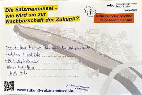 Vielfältige Wohnkonzepte stehen im Mittelpunkt der Entwicklung auf der Salzmanninsel. Die eingebrachten Ideen und Bedarfe spiegeln eine breite Palette an Bedürfnissen für vielfältige, inklusive und bezahlbare Wohnformen wider: Mehrgenerationenwohnen zur Förderung des sozialen Miteinanders, Familienwohnungen, die den Bedürfnissen gerecht werden, bezahlbarer Wohnraum für alle, insbesondere für junge Menschen wie Starter und Studenten aber auch Alterswohngemeinschaften und betreubares Wohnen sind ein zentrales Anliegen. Ebenso wurden Überlegungen zu Genossenschafts- und Baugruppenprojekte angestellt, um den zukünftigen Wohnraum kollektiv zu gestalten und zu verwalten. Neben den Wohnformen wurde auch über eine mögliche Kommunikationsplattform nachgdacht: die Wohnungstauschbörse Traunstein. Immobilienbesitzer:innen bzw. Wohnungssuchende sollen hier in einen Austausch treten können und ihre Wohnformen tauschen können. So kann sichergestellt werden, dass die Anforderungen an den Wohnraum dem jeweiligen aktuellen Bedürfnis entspricht und bestehende Ressourcen genutzt werden.
