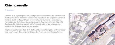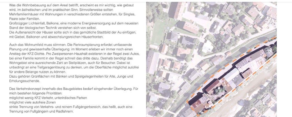 wäre das Ausweichparken auf fußläufig gelegene Parkplätze, wie dem Parkplatz direkt beim Schwimmbad und dem Festplatz, der allerdings nicht das ganze Jahr genutzt werden kann. Dies würde zwar die Parkbelastung auf der Insel reduzieren, hätte aber erheblichen Einfluss auf die Nachbarschaft und ihre Qualitäten. Der Vorschlag eines Parkhauses bei der Chiemgauhalle ist eine weitere Möglichkeit, die Parkproblematik anzugehen. Es wäre wichtig zu überlegen, wie die Nachbarschaft an diesem Projekt partizipieren kann und welche Vorteile es für die gesamte Gemeinschaft bietet. Ebenso wurde die Einführung von Car-Sharing und Lastenrad-Sharing als nachhaltige Mobilitätslösungen diskutiert. Auch hier ist es erforderlich, Flächen dafür bereitzustellen