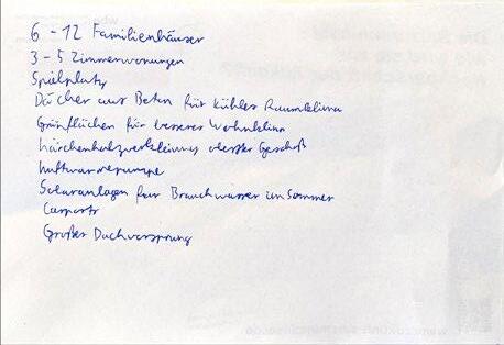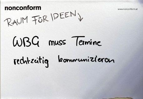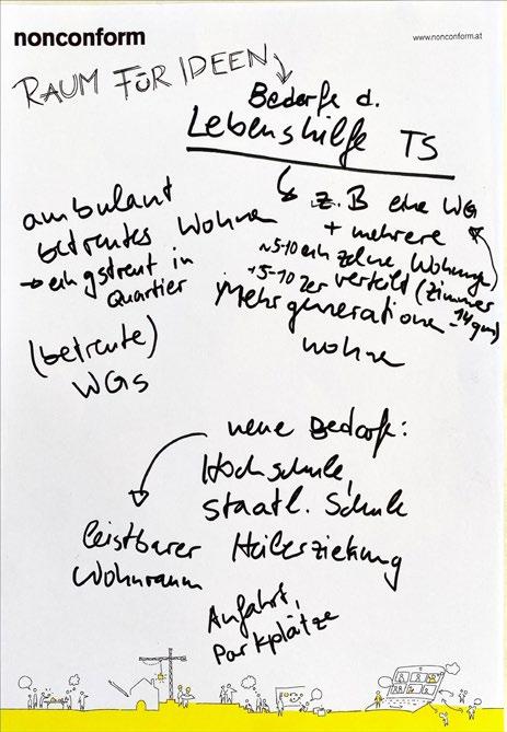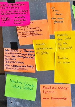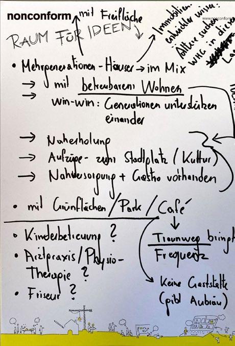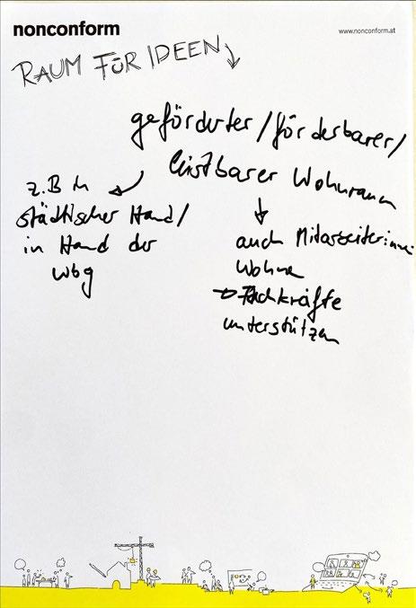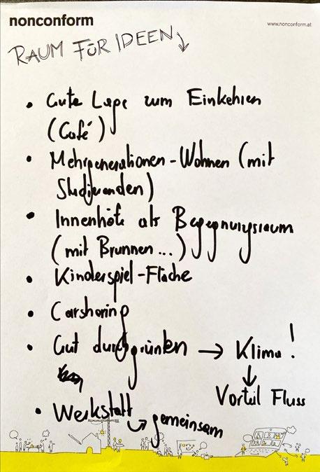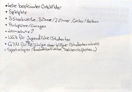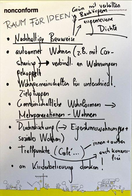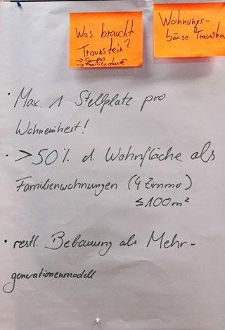 Eine wesentliche Forderung stellt dabei das Thema des Mehrgenerationen-Wohnens dar: Gegenseitige Unterstützung im Alltag, sei es beim Einkauf, der Kinderbetreuung, Reparaturen, etc. wurde von vielen als erheblicher Mehrwert eines künftigen Wohnprojekts ausgemacht. Eine weitere Idee, die im Laufe des ersten Tages immer mehr Gestalt angenommen hat, ist der Vorschlag einer Tauschbörse für Einfamilienhäuser. Ältere Personen haben die Möglichkeit ihre Immobilien mit Familien zu tauschen und erhal-
