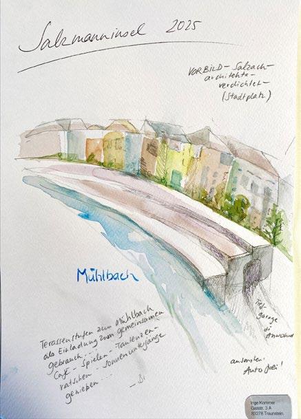 Die Definition von schöner Architektur ist vielfältig. Die Gestaltung des Areals sollte auf ein ausgewogenes Verhältnis von Gestaltungselementen achten, um ein ansprechendes und attraktives Umfeld zu schaffen, das sowohl den Bewohnerinnen und Bewohnern als auch der umliegenden Gemeinschaft ein positives Gesamtbild bietet. Eine Idee wäre, dass „höhere“ Gebäude mit öffentlichen Bereichen oder Einrichtungen auf den Dächern kombiniert werden, um sicherzustellen, dass die Nachbarschaft von diesen Entwicklungen profitiert. Darüber hinaus könnte die Ausrichtung der Balkone in Richtung der Traun erfolgen. Generell würde die Erhaltung der Orientierung in Richtung Traun ist ein weiterer Aspekt sein, der die Identität und Akzeptanz des Projekts fördern kann. Die Einbindung von begrünten Elementen, wie Dächern und Fassaden, wäre nicht nur ein optisches Gestaltungselement, sondern würde sich auch positiv auf das Mikroklima und die Kühlung auswirken.