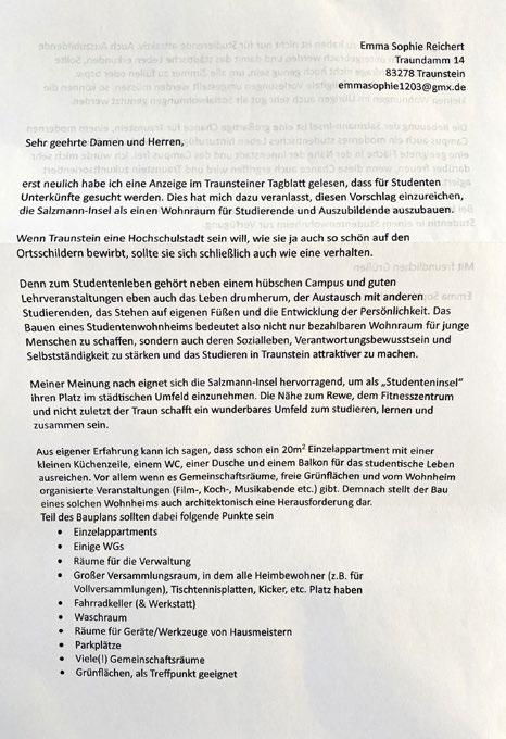 ab, Wohnraum für unterschiedliche Einkommensgruppen zugänglich zu machen. Die Schaffung eines Vorbildprojekts für das Wohnen der Zukunft in Traunstein erfordert Mut, Innovation und soziale Verantwortung. Es bietet die Chance, die Lebensqualität für alle Bürger:innen zu steigern und Traunstein zu einem Vorreiter in der Gestaltung der Wohnlandschaft der Zukunft zu machen.