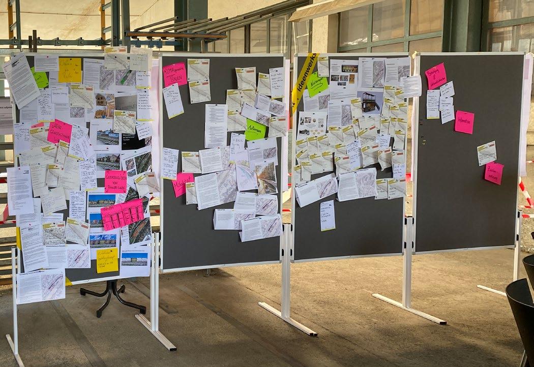 Unzählige Ideen sind für die Entwicklung zur Zukunft der Salzmanninsel eingereicht worden, analog und digital. Während der Ideenwerkstatt wurden diese an der Ideenwand in der ehemaligen Fertigunghalle der F. Salzmann sortiert und für alle sichtbar aufgehängt. Folgende Themen wurden dabei herausgearbeitet:
