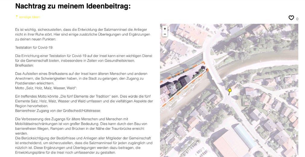 Die Anliegen und Vorschläge zur Beteiligung unterstreichen das Bestreben der Gemeinschaft, in den Entscheidungsprozessen für die zukünftige Entwicklung der Salzmanninsel aktiv involviert zu sein. Die Schaffung von transparenten Informationswegen, das ernsthafte Beachten der Meinungen und die Möglichkeit zur Teilnahme durch die Einrichtung eines Bürger:innenrats wurden dabei als Beispiele für eine partizipative Entwicklung des Gebiets genannt.