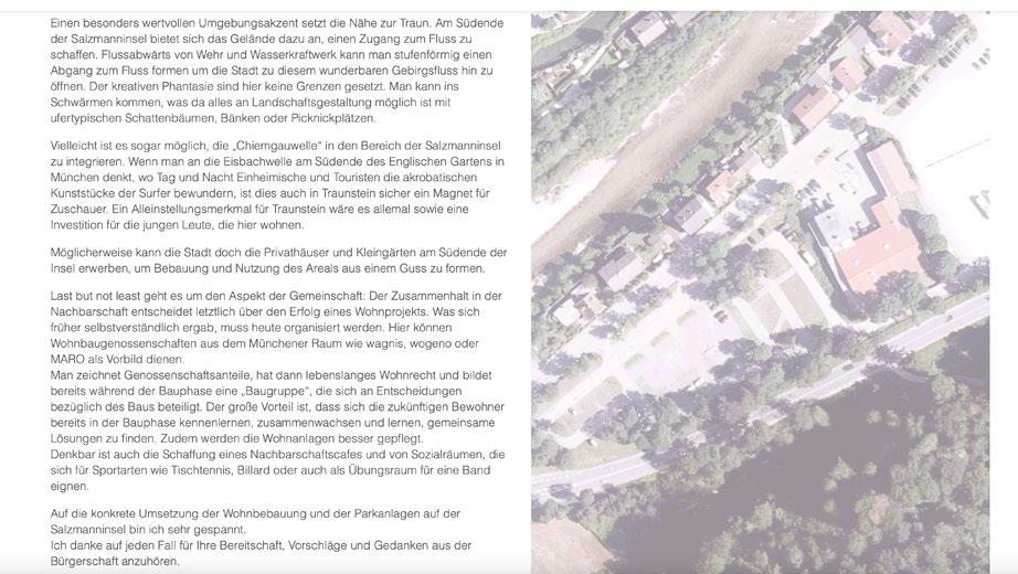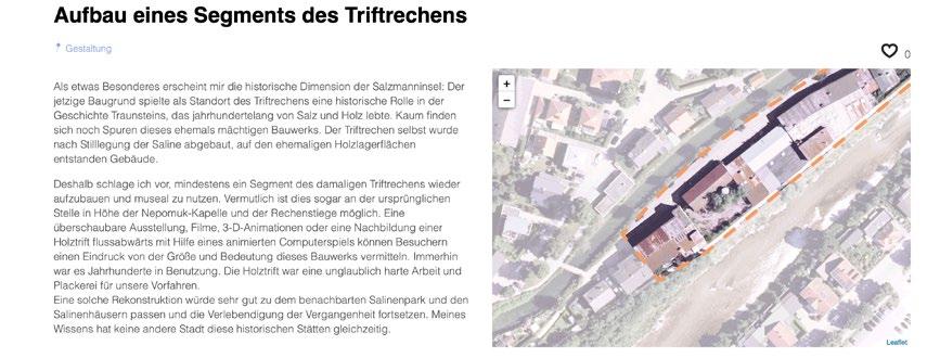Seit kurzem ist bekannt dass die Stadt Traunstein die Triftinsel (früher Salzmanninsel) dankenswerterweise nun doch nicht verkaufen, sondern in eigener Regie entwickeln will. Dies würde die einmalige Gelegenheit eröffnen ein Denkmal bzw. ein Informations-Zentrum zu errichten.