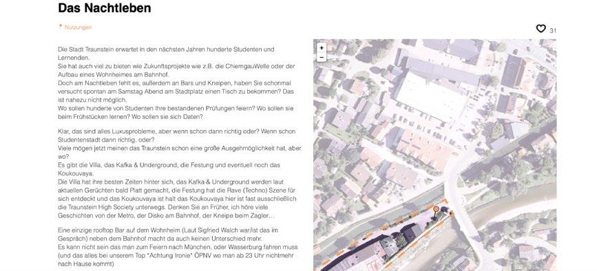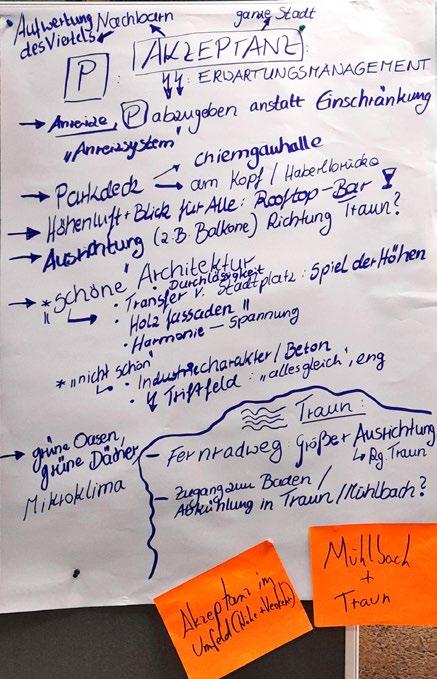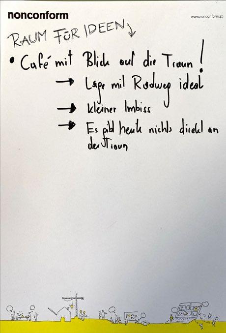 Sie schlugen verschiedene Sportanlagen vor, darunter ein Open-Air-Gym oder einen Basketballplatz. Zudem betonten sie die Bedeutung von Aufenthaltsflächen im Freien, wie Grillplätze, Spielplätze und Badeplätze, wobei der Zugang zur Traun als ein wichtiger Bestandteil dieser Freizeitgestaltung angesehen wurde.