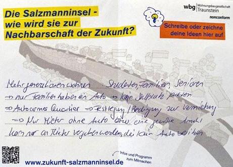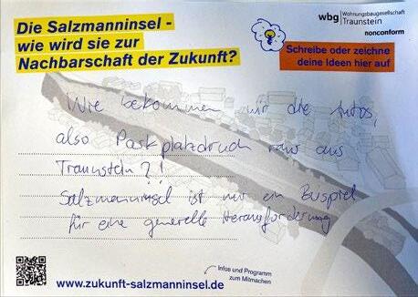 Die Vision eines autofreien Quartiers ist ein weiterer deutlicher Ausdruck des Wunsches nach einer lebenswerten und nachhaltigen Umgebung. Trotzdem wurde von vielen auch die Notwendigkeit geeigneter Parklösungen betont, sowohl für das Quartier als auch für die gesamte Nachbarschaft. Ein umfassendes Park- und Verkehrskonzept für ganz Traunstein würde dazu beitragen, den Verkehrsfluss zu optimieren und die Parkplatzsituation zu verbessern.