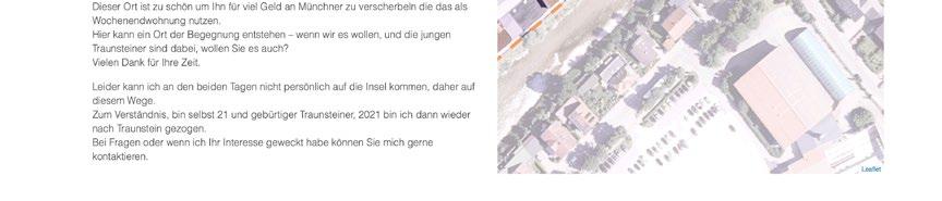 Ein weiterer gewünschter Inhalt des zuküftigen Projekts ist der entstehende Treffpunkt, der für alle Traunsteiner:innen einen Mehrwert bringen soll: Es könnte einen kleinen Kiosk geben, indem kleine Getränke und Speisen, wie beispielsweise Kuchen von Nachbar:innen od. ä., angeboten werden, ohne jedoch der Innenstadt Konkurrenz zu machen. Dieser Treffpunkt soll die soziale Interaktion fördern und die Gemeinschaft auf der Salzmanninsel stärken.