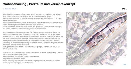 Ein Schwerpunkt lag auf dem rücksichtsvollen einfügen des Wohnprojektes in die nachbarschaftliche Bebauung und der ästhetischen Aufwertung der Umgebung. Die Teilnehmer:innen betonten die Bedeutung von freier Sicht und Durchblicken, wobei die Gebäudehöhen so gestaltet werden sollten, dass sie sich an den vorhandenen Strukturen orientieren.