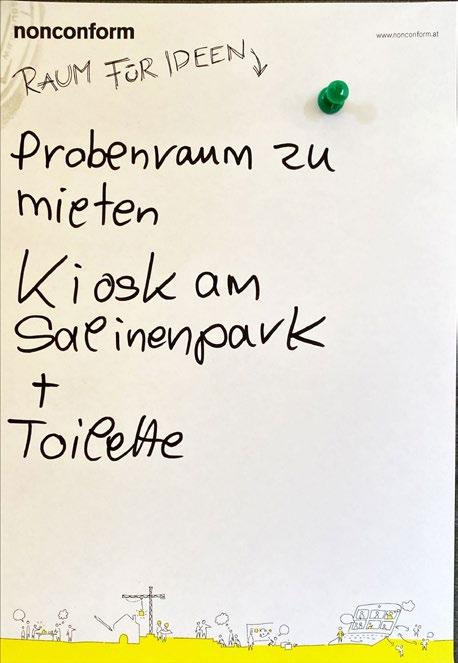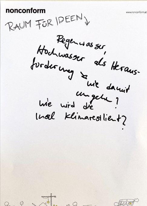 für Menschen jeden Alters und Hintergrunds werden kann. Am häufigsten wurde der Bedarf nach einem kleinen Café oder Kiosk bzw. Späti eingebracht. Dies soll die Insel bereichern, ohne mit den bestehenden Angeboten in der Altstadt in Konkurrenz zu treten.