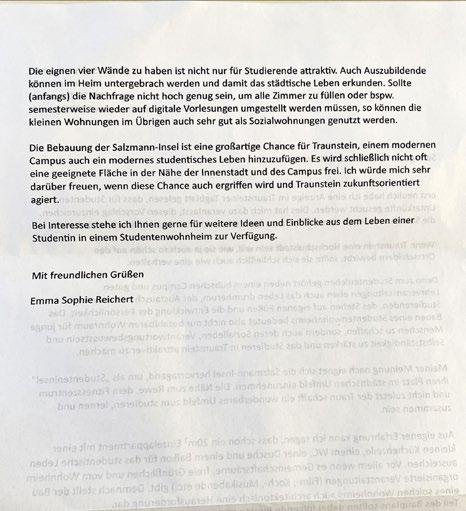 Die Schaffung eines leistbaren Wohnprojekts der Zukunft, das sowohl ökologisch als auch sozial nachhaltig ist – das ist die Vision, die viele Traunsteiner:innen für die zukünftige Bebauung auf der Salzmanninsel haben. Das Projekt soll sich demnach an verschiedene Zielgruppen, darunter Studierende und junge Erwachsene, Alleinerziehende, Familien und ältere Bürger:innen, die auch im Alter aktiv am gesellschaftlichen Leben teilhaben möchten, richten.