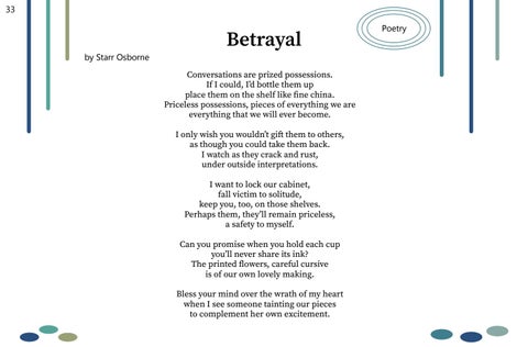 Betrayal Conversations are prized possessions. If I could, I’d bottle them up place them on the shelf like fine china. Priceless possessions, pieces of everything we are everything that we will ever become. I only wish you wouldn’t gift them to others, as though you could take them back. I watch as they crack and rust, under outside interpretations. I want to lock our cabinet, fall victim to solitude, keep you, too, on those shelves. Perhaps them, they’ll remain priceless, a safety to myself. Can you promise when you hold each cup you’ll never share its ink? The printed flowers, careful cursive is of our own lovely making. Bless your mind over the wrath of my heart when I see someone tainting our pieces to complement her own excitement.