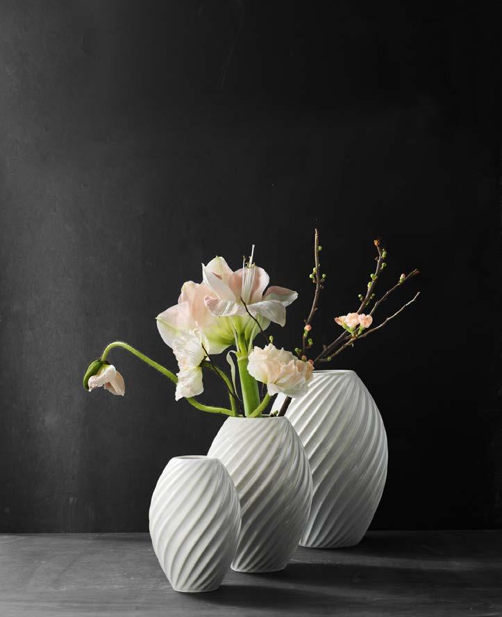 Det lekre diagonale spiralmønsteret snor seg elegant om de slanke vasene og gir dem et spennende uttrykk. Utført i porselen og glassert med en fin hvit glasur. Kommer også i sort. Fås i 16cm, 21cm og 26cm.