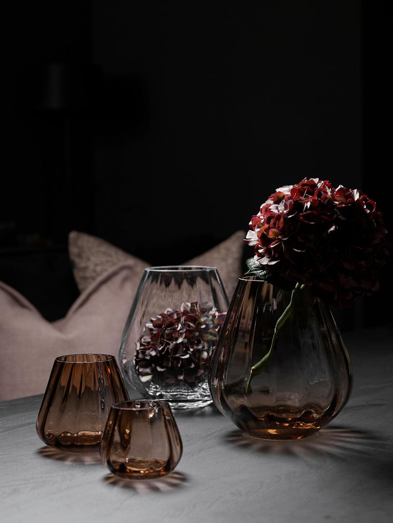 Den vakre skulpturelle formen og det fantastiske fargespillet gir hver vase sitt eget unike flammelignende preg. Vakker både med blomster, eller uten. Kommer også i hvit. Fås i 15cm, 19cm og 23cm.