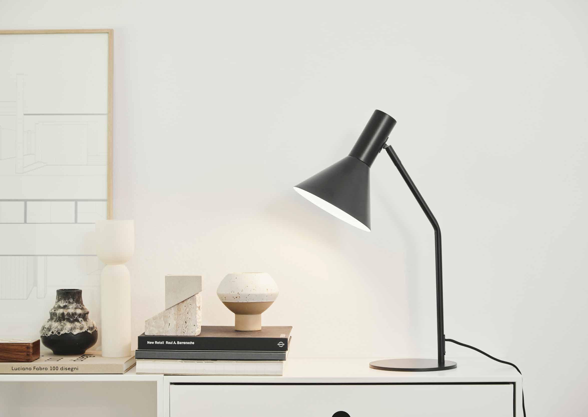 Við nýtulkingini hjá Ingu Sempé bjóðar Matin eitt nútímans og listaligt snið við einum bygnaði, sum sammetir visuella delikatessu við styrki. Tað, ið eyðkennir lampuna, er plisseraði bummullskermurin, sum er settur á ein tunnan, geometriskan jarnhaldara. Lampan hevur innbygt LED, so tú kanst økja ella minka um ljósstyrkina eftir tørvi. Sjarmerandi klassiska lampan veitir eitt elegant ljós til skrivstovuna, kamarið ella stovuna.