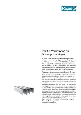 Traditie, Vernieuwing en Ontwerp door Rapid Al vanaf 1936 houdt Rapid zich bezig met het verbeteren van de ontwikkeling, de productie en de marketing op het gebied van nieten en hechten. Inmiddels zijn we op dit gebied een specialist op de wereldmarkt. Tegenwoordig verkopen wij onze producten in meer dan 120 landen en is Rapid een sterk merk binnen de Esselte Groep. Rapid is werkzaam op 3 gebieden: KANTOOR – nietmachines en perforators voor kantoor en thuis, GEREEDSCHAPPEN – professioneel gereedschap voor de bouw maar ook voor reparatie- en decoratiewerkzaamheden thuis en tenslotte NIET UNITS – geïntegreerde niet units voor kopieermachines en printers. Het hedendaagse Rapid merk staat stevig in de markt dankzij 3 belangrijke waarden die tot uitdrukking komen in alles wat wij doen: Traditie, Vernieuwing en Ontwerp. Behalve dat wij in staat zijn om snel te reageren op de behoeften van onze klanten, hebben we controle over het hele proces van ontwikkeling tot verkoop en dit heeft ons tot marktleider gemaakt. Het marktleiderschap is geconsolideerd in onze kwaliteitscontrole, welke mogelijk gemaakt wordt door eigen productie en door onze toegewijde partners en distributeurs. Rapid werkt voor u in Research & Ontwikkeling, Productie, Distributie, Marketing en Verkoop. Wij maken uw dag efficiënt.