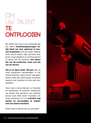 OM UW TALENT TE ONTPLOOIEN Bij Virax zijn wij er van overtuigd dat uw talent kwaliteitsoplossingen nodig heeft om zich optimaal te kunnen ontplooien. Om die reden werken onze teams iedere dag opnieuw met grote zorgvuldigheid en enthousiasme in dienst van de kwaliteit; niet alleen die van de producten, maar ook die van de service. Het is nu bijna sinds 100 jaar dat wij onze producten vervaardigen in het Franse Epernay. Deze keuze was geen toeval, maar een overtuiging: wij kiezen bewust voor kwaliteit en dus ook voor loyaliteit. Door naar al onze klanten, in Frankrijk en daarbuiten, te luisteren, verbeteren wij iedere dag opnieuw ons aanbod, terwijl onze r&D team innoveert om onze producten en uw activiteit nog sterker en eenvoudiger te maken, met een betere kwaliteit. Onze inzet in dienst van uw activiteit!