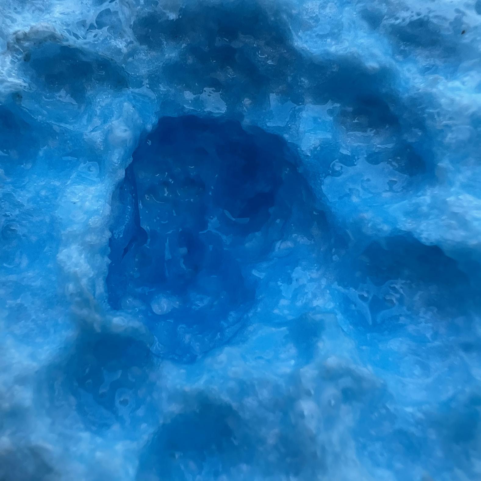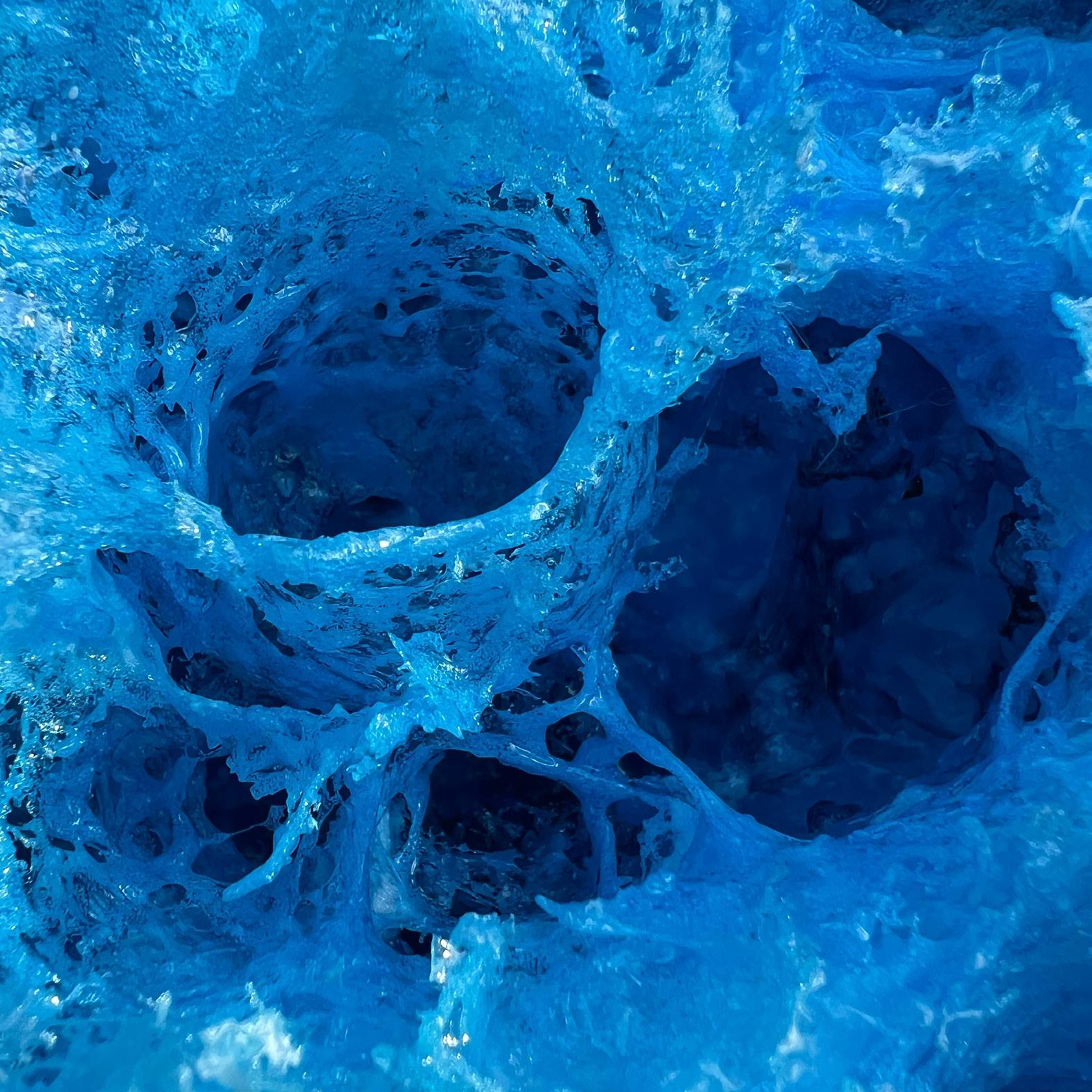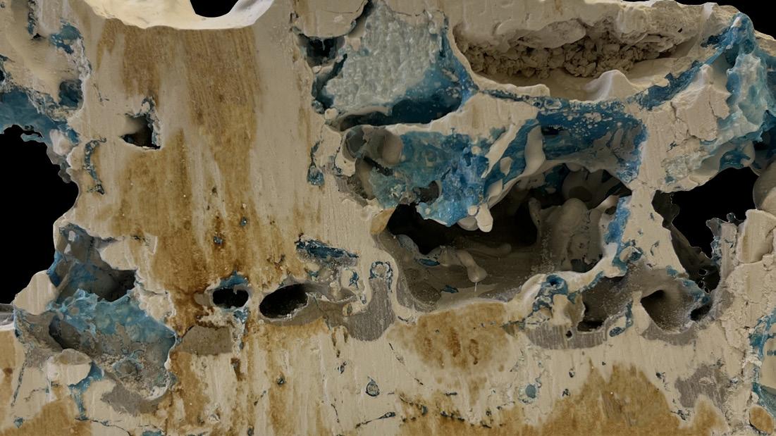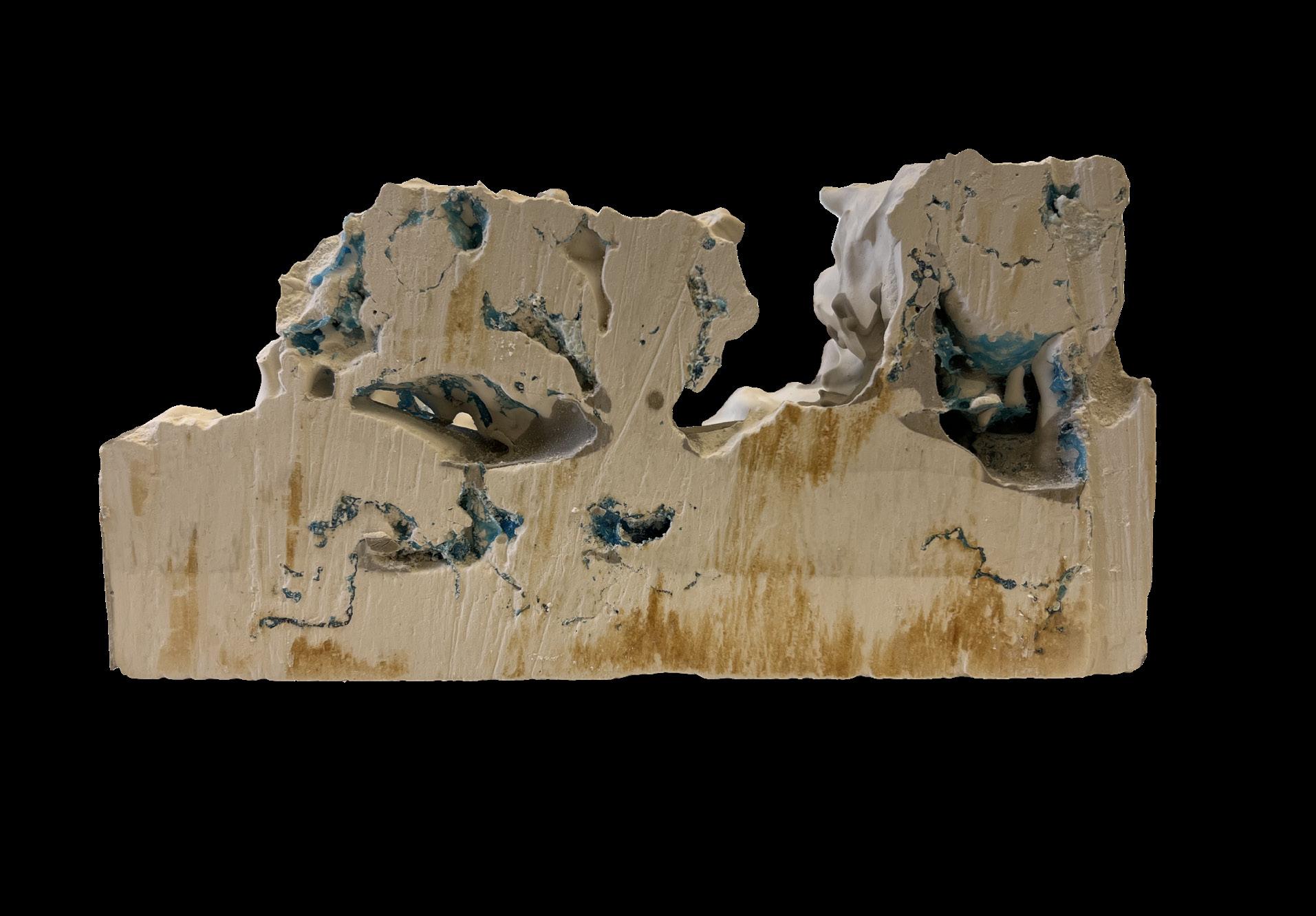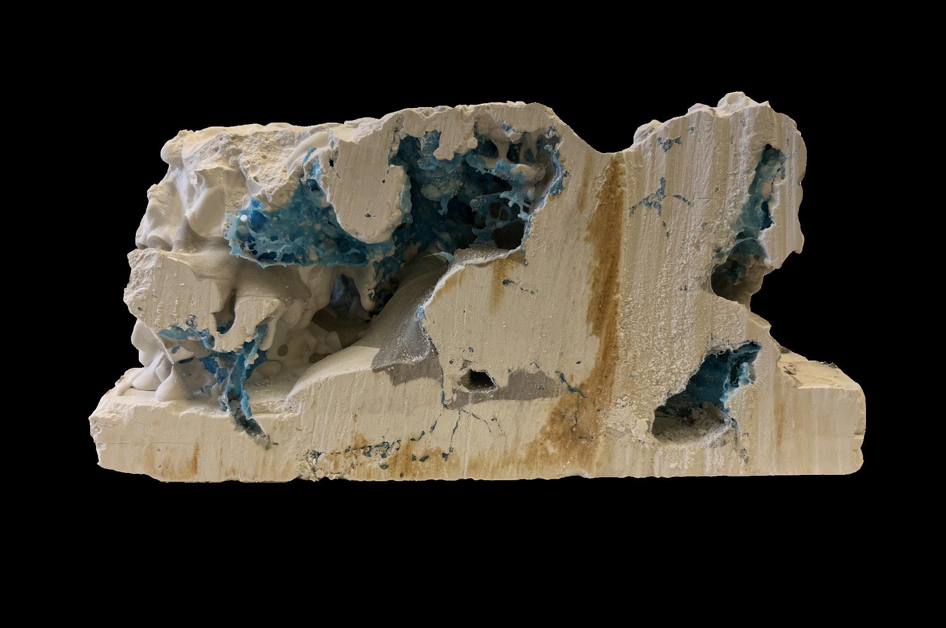 At this stage, I was interested in the spatial conditions the models heavily coated with plaster could offer. I sliced some of these with a handsaw to see the sectional conditions of these, better understanding elements of depth, color, texture, and form. Spacious voids were created within the different sections, demonstrating the various levels of porosity and density the melted blue foam models offered.