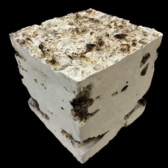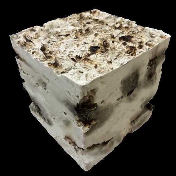The first series of cubes estimate what the effects of constant flooding would look like on a material. The humidity starts darkening it, later resulting in the growth of moss from the particles carried through the water and making the material weaker until it breaks.