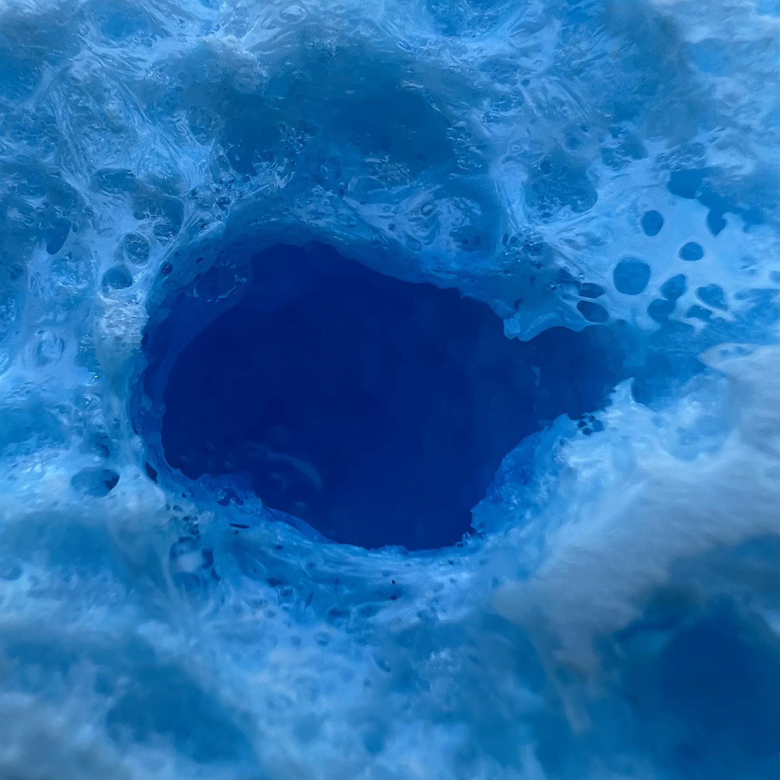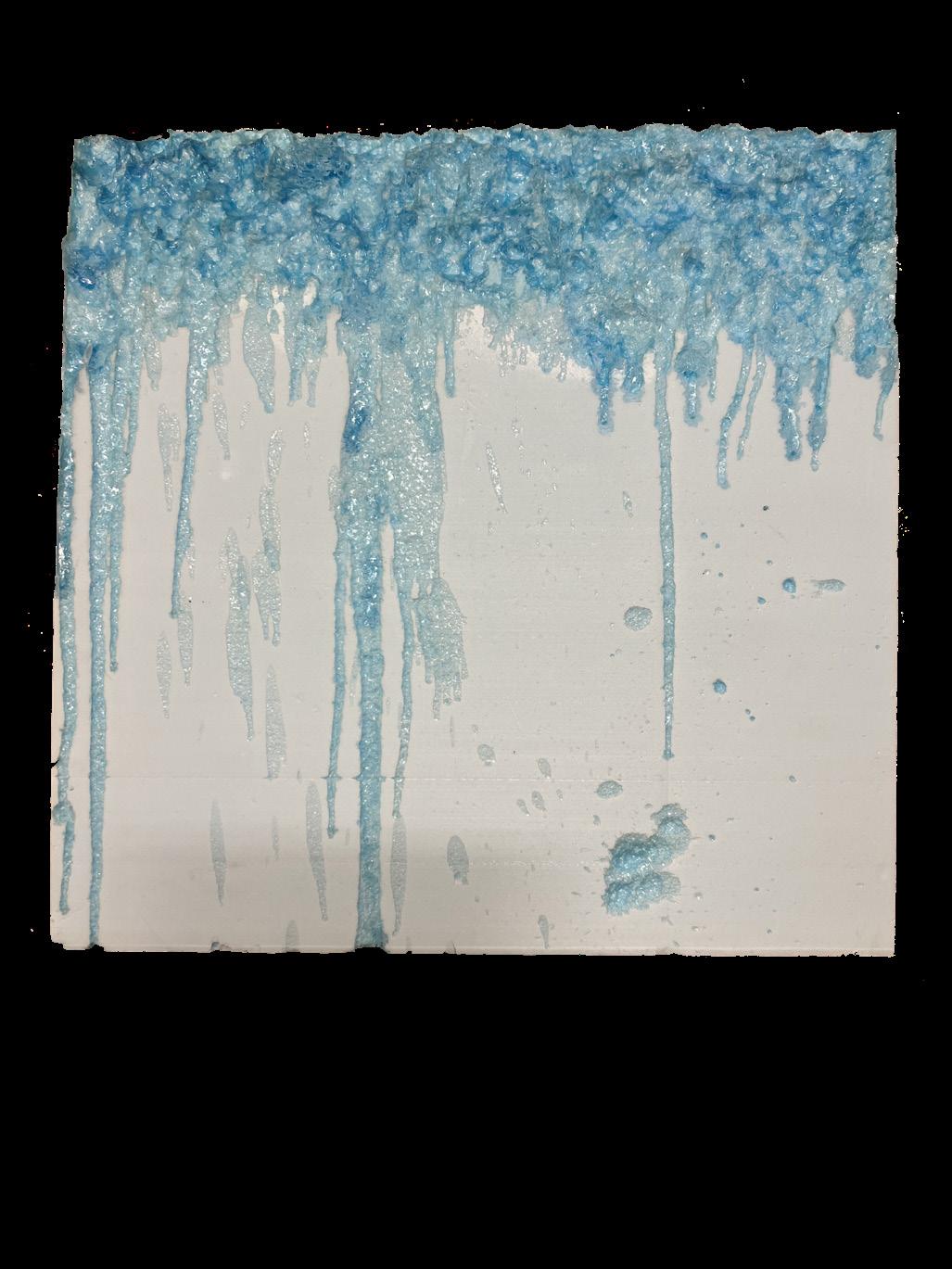 For my second iteration, I placed the foam vertically and let the acetone drip across the material. As the top part would start to harden, the acetone would keep sliding freely across it reaching the lower parts of the foam. Rather than affecting the top layer of the material to create a ripple effect on the surface, which was what I initially predicted, the acetone instead perforated the condensed material, moving through the existing pores and ultimately exaggerating them as a result.