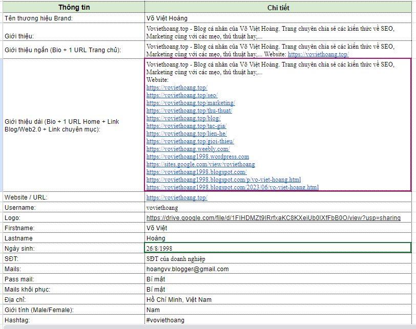Giới thiệu dài (Bio + 1 URL Home + Link Blog/Web2.0 + Link chuyên mục):